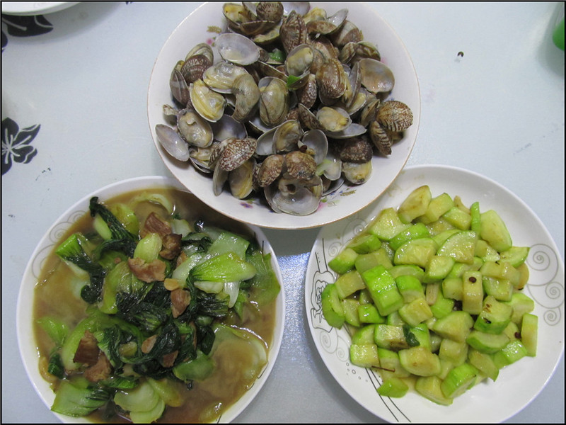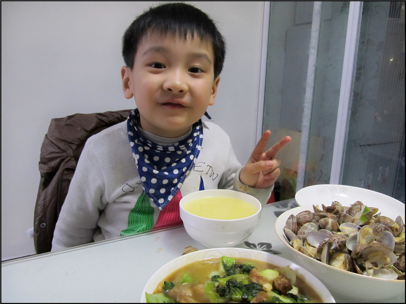 老公回来的比较晚,所以先做的是清炒小瓜,把小瓜切好洗净后,油锅加热。然后将葱丝、花椒等调料放入油锅中爆出香味,最后把小瓜放入锅中翻炒。炒好后有一点汤汁出来,所以非常好吃。油菜炒肉也是极为简单的,先把肉炒至八成熟,然后加入洗净的油菜翻炒,最后加入盐和鸡精调味即可。因为油菜是刚洗好的,所以难免会有多一些的汤汁,Aric比较爱泡馒头,有味。 蛤蜊还是热着吃最好,老公确认了几点回来,我就提前5分钟炒好。油锅加热后,放入葱丝、花椒和姜丝,然后在油锅很热的时候,直接放入洗净的蛤蜊。这时锅爆油比较严重,所以一定要盖好锅盖哦。最后加入盐等调料,美味可口的爆炒蛤蜊就做好了。主食是馒头,老公不太爱吃米饭,我和Aric一般都是按照老公的口味来吃。煮了大米小米粥,一顿饭吃的开心又舒爽啊。 ![]() 油菜炒肉,因为提前炒好,所以凉了点,卖相也差了点。 ![]() 清炒小瓜,比较清淡的家常菜。 ![]() 爆炒蛤蜊,刚出锅的最好吃哦。 ![]() Aric看着都是他最爱吃的菜,特别开心呢。 ![]() 蛤蜊放在了老公和Aric面前,父子俩负责吃光,而我比较偏爱清淡的油菜和小瓜。
