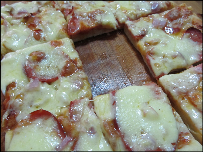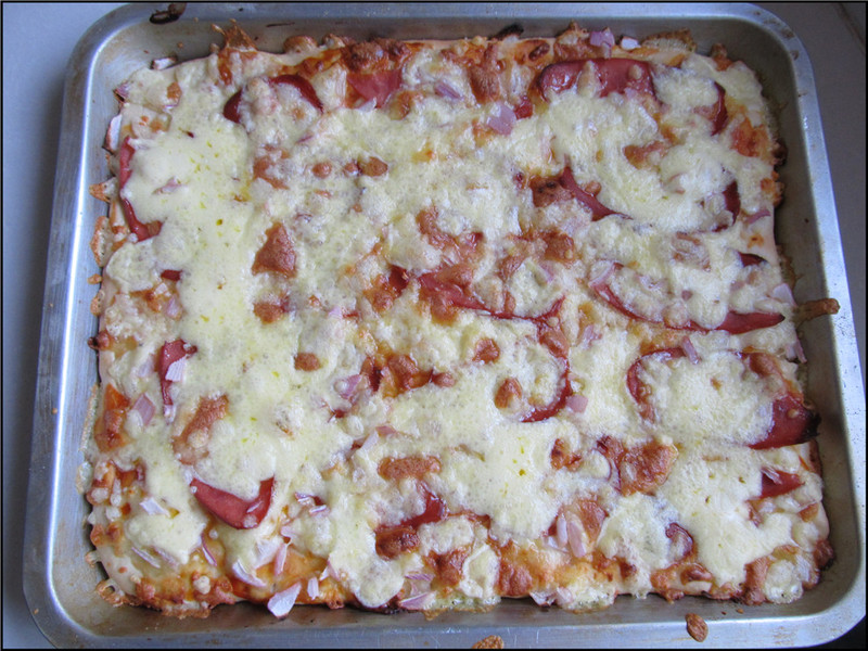 老弟最近迷上了做披萨,其实他是有那个开披萨外卖店的冲动,只是家人都不支持。因为老弟希望可以辞职下来,专门做披萨,平时主要是外卖。原本他的想法是挺好的,可是一听说他要辞职,老爸老妈就急了,死活不同意。可是老弟就非常倔强的坚持他的看法,因此老妈想了一个主意,让他在家里做一做披萨试试,如果好吃可以考虑,如果一般的话,那么不好意思,你老老实实去上班吧。 这不,老弟就买了一大堆的材料回来,由老妈来发面,老弟在上面抹了番茄酱,加了火腿片和洋葱,还想放其他食材的,因为家人口味都比较清淡,所以只放了这两样。最后撒上芝士放入烤箱,10几分钟后又拿出来撒了一层芝士,再放入烤箱。在我们等待披萨出炉的时候,一家人就坐在一起商量着老弟的想法。我是觉得老弟想法挺好的,可是不太现实,毕竟老弟现在可是没有什么都不用顾虑就下海的资本啊。