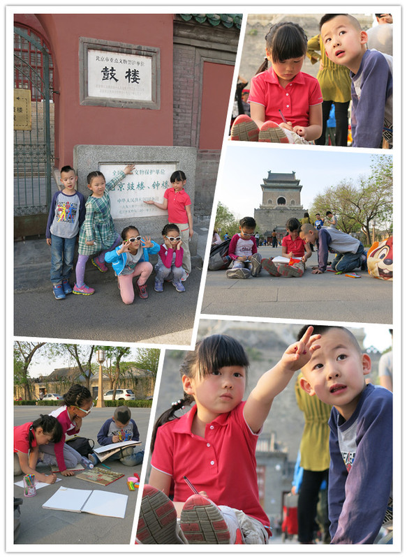 早上八点到下午六点,十个小时的学习时间,十公里的徒步,我们的孩子们太给力了。 活动感受: 1、志愿者童童妈妈根据绘本《中轴线上的城市》准备好了中轴线的课程,给孩子们讲了中轴线的地理位置,历史,人文及相关知识,此活动做到了有的放矢,让孩子们对北京城的建造大致有所了解。这里对志愿者表示衷心感谢。 2、谦益崴脚,童童的流鼻血,孩子们互相鼓励与帮助,是良好团队的基础,用童童妈妈的话来说:“我们的孩子在活动中遇到问题,自己解决,是有所交集的活动。”。 3、无迟到现象,活动中途无人退场,大家自觉遵守活动纪律。 4、谦益在行走路线中,见到正阳门,故宫角楼,景山公园的郁金香后,便要用绘画来记录,让我知道了他是多么喜欢绘画。 5、谦益肠胃受寒,看着同伴吃冰激凌,没有要吃,对他是意志忍耐的考验。 6、巧手美美妈给孩子们梳各种编辫,感叹,要是生了女孩子,我这个笨手怎么满足孩子爱美的要求? 7、走故宫宫墙外围的时候掉队了,我也有涣散的状态,但看见悠悠爸爸在烈日下等着我们(31度),很感动,也惭愧。 8、志愿者讲课时,我聊天,没有给孩子起好作用,私下受到批评,以后改正。 9、谦益执意要在万春亭画画,我们便停留下来,脱离队伍,没有考虑团队进程,以后改正。 活动过程: 早上八点整,永定门城楼下集合,志愿者童童妈给孩子讲绘本《中轴线上的城市》,给孩子们留任务,找4颗龙头星,那是建造北京城的时候的坐标点----三点连一线。谦益找到了两颗星。 ![]() 这是永定门城楼,坐标线上的点是用龙头标识的,这个坐标是仿制的,上面有公里数(按丈标记的)。 ![]() 正阳门前的合影(俗称:前门楼子): ![]() 天安门广场东侧,修整队伍,画画,吃冰棍,等上完课后赶来活动的美美小朋友。 三个孩子拿着冰棍,围着画画的谦益,谦益默默的看着他们手中的冰棍,难为孩子了。 童童跟悠悠因为画画起了争执,之后童童流鼻血了,谦益不知详情,对悠悠说:“你打她了?”······ 谦益画了永定门,但是上面的炮孔是正阳门的。本来画的不错,但他又刻画了墙砖,我觉得有点繁琐了。 ![]() 天安门前的合影: ![]() 经过了天安门到达午门时,感受到了我天朝是人口大国的霸主地位。人多的让我们牵着孩子不敢撒手。 午门前,孩子们的顽皮。在筒子河前的修整队伍,孩子,家长一人一根冰棍,除了肠胃不爽的谦益。在天安门前,谦益能忍受孩子们吃冰棍,但是这次他看见我和爸爸也吃了,立刻委屈了,眼圈有点红了。经协商后,我们做了让步,允许他吃小半根。 ![]() 午餐后,我们一路上山,见到了80多岁的老奶奶也在爬上,佩服。登上了景山的山顶万春亭,小朋友们都去俯看故宫的风景了,谦益直接进到大殿里,虔诚的磕头念经去了。 参拜完毕,走出大殿,谦益俯瞰故宫,说要画画。刚才路过故宫角楼的时候便要画画,这次我不好拒绝他了。铺开速写本,谦益顶着太阳开画。 谦益画了故宫的玄武门,之后,鸟瞰了皇城。远处的国家歌剧院也画了进来(右上)。 万春亭西侧可以鸟瞰北海,北海的白塔也入画来。(右上角) (左上角方格内)这是谦益画的早上在永定门的集合地点,孩子们坐在台阶上听绘本(台阶上的箭头),家长在旁边的箭头下集合。 (中间)谦益画了坐标的四个点,并标注要走10公里,今天的活动他记住了。 (右下角)谦益看绘本的时候,记住了古代的交通工具小轿子,画了出来。 ![]() 这是谦益的第一次写生牡丹,还是感觉不错的,他画完牡丹还要画郁金香,但队伍要行进了,拍了照片。 ![]() ![]() 记忆郁金香: ![]() 这是在路边休息的时候,谦益画的神花:一圈的武器(护法),谦益说,献给佛。 ![]() 中轴线的终点:鼓楼(下午六点)。 ![]() 谦益坐在广场上,画了钟楼,我告诉他:要把屋顶两侧的螭吻画出来。 ![]() 这是谦益画的鼓楼,他很遗憾的说:画歪了。