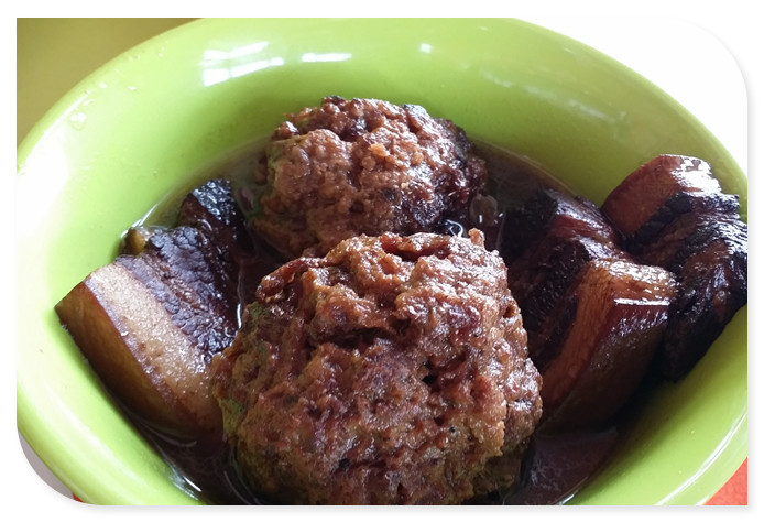 这碗里装的就是把子肉了,这还真是挺让自己吃惊的,没想到把子肉居然是这个样子的,简直就是大片的五花肉嘛,看外观真是没啥特别的,老公点了2片。还有2个丸子,这个丸子的味道还是不错的,挺细腻入味,我和孩子都爱吃。至于这大名鼎鼎的把子肉就老公一个人享用吧,不过2片把子肉老公也只是吃了其中的一片而已,另外一块实在是太肥了,连一向肉的老公都无从下口干脆放弃了。