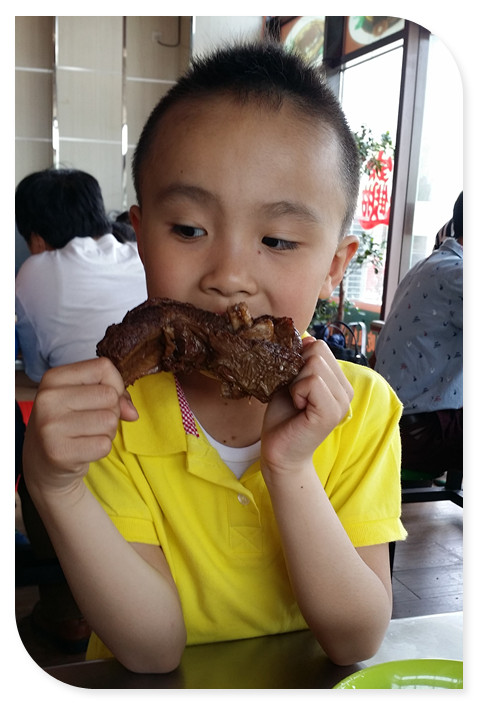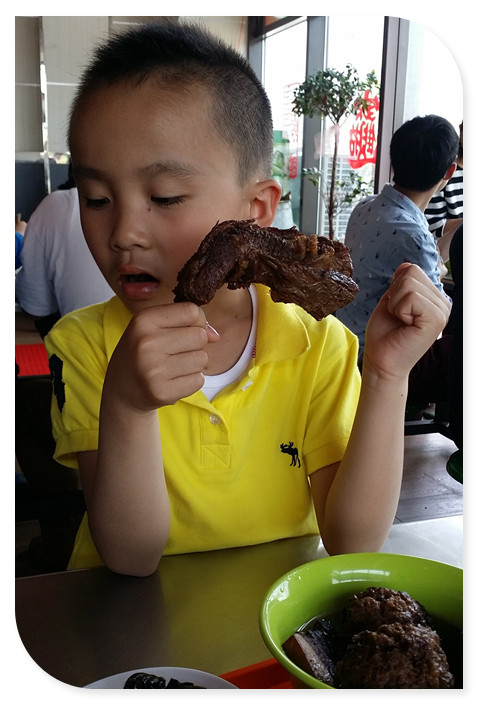 挺有意思的是最初我是把小家伙手里拿的这肉当成把子肉的,这个和把子着名字想象一下还挺贴切的,结果这个还不是,这就是点的排骨肉,在我看来无论是外形还是味道都比把子肉要好呢,孩子也是更喜欢吃这样肉肉的,肉瘦而不才,味道也好,小家伙吃了大部分。当娘的是真喜欢看娃娃如此大口吃饭,大口吃肉的摸样啊!
