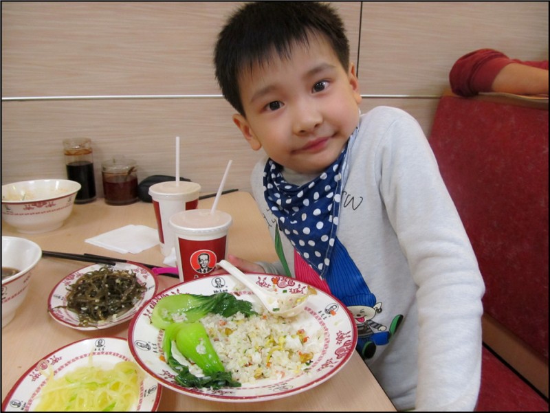 Aric这时问了,那我吃什么啊?我问他,你想吃面还是想吃米饭?Aric想了想说,我想吃饭。我们看了很多,但是Aric最终点的是蛋炒饭套餐,这个他最容易接受,其他的虽然看着不错,但是他怕自己不爱吃。这个蛋炒饭套餐看着还是挺好的,米饭、胡萝卜、鸡蛋等一起炒制而成,还配了一个菠菜蛋花汤。Aric说最爱喝菠菜蛋黄汤了,因为妈妈从来没做过,但是幼儿园里喝过,很爱喝。 如果你要问Aric最不喜欢吃什么,他绝对不假思索的回答是胡萝卜。但是这个蛋炒饭中还带有胡萝卜,他竟然全部吃掉了,还说很好吃,一点儿也吃不到胡萝卜的味道。另外盘上配了两根Aric最喜欢的有小菜,也得到了Aric的好评。最后点了几杯饮品,都是橙汁、桃汁一类的,可惜不是鲜榨的果汁,估计是直接粉冲出来的,所以味道很淡。山东人还是比较爱吃汤汤水水的面的,所以我会选择这里。 ![]() 凉拌土豆丝 ![]() 凉拌海带丝 ![]() 辣味的红烧牛肉面 ![]() 炸酱面 ![]() 不辣的红烧牛肉面 ![]() Aric点的蛋炒饭套餐 ![]() 还配了一碗菠菜蛋花汤 ![]() Aric可是很爱吃的呢,特别是小油菜和蛋花汤,都是他的最爱。