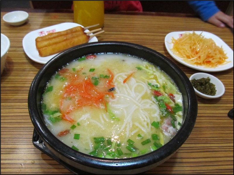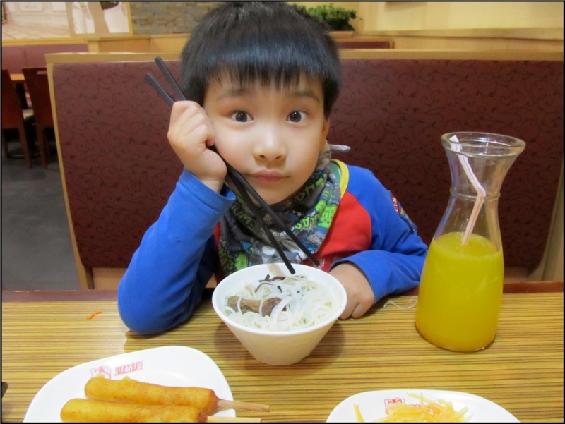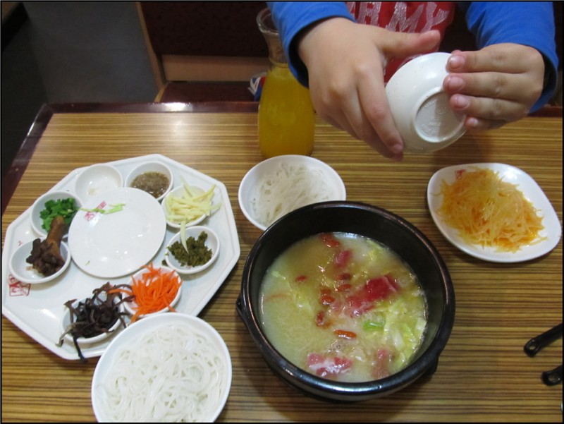 我对过桥米线一直非常钟爱,但是老公不爱吃,他觉得米线吃不饱,又没什么味道,因此我们吃过桥米线的次数屈指可数。但是老公偶尔晚上会不回来吃饭,所以我和Aric也就经常偷偷出去吃饭。不过一直偷吃的是老公也不喜欢的水煮肉片,而最近我对水煮肉片有点不感冒,所以昨晚,我和Aric去偷吃了过桥米线。我可不敢告诉Aric这是偷吃,省的他说我撒谎,但是嘛,他陪我去还是挺高兴的。 原本是打算团购代金卷的,但是到了米线店里服务员说套餐其实和代金卷差不多的,所以就干脆不团购了,直接点吧。我点了一个过桥米线的套餐,那是一个牛肉的米线,被我换成了猪肉的,另外还有一个凉拌土豆丝,其实也就是土豆丝炒熟了以后放凉了,才叫凉拌的吧。Aric说渴了想喝果汁,我问他想喝什么,小家伙说想喝鲜榨的橙汁,他最近特别钟爱这个,于是又给他点了杯果汁。