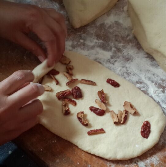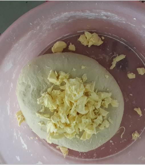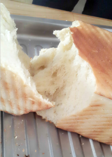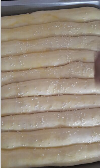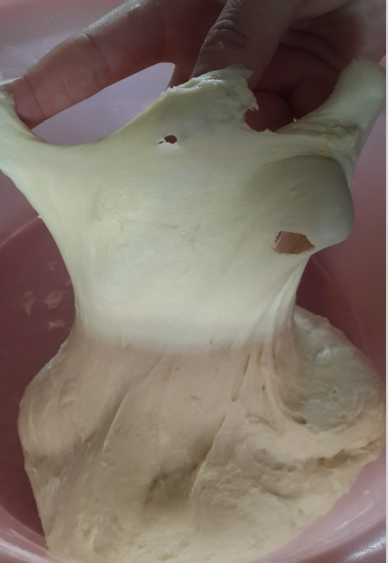 面粉:600g (普通面粉) 牛奶:340g 鸡蛋 :两枚 黄油:60g 奶粉:30g 盐:3g 酵母:8g 白糖:120g 具体步骤如下: 1、除黄油外的所有材料放入盆中,开始揉面,可以拉出粗膜。 ![]() 2、将黄油切成小薄片加入面团中,继续揉至面团能够拉出透明的薄膜,达到完全扩展。这时拉出的膜即使会破,洞的边缘也是比较规则的!(面团虽然比较湿,但是加入黄油后揉好的面团是不会粘手的。悄悄的说声,现在的我已经很享受整个的揉面过程了哦!) ![]() ![]() 这时的面可以拉出膜了,即使破了,边缘也比较完整了 ![]() 3、发酵,直到面团发酵至原体积2-3倍大。(标准:手沾少许面粉按入面团,面团不会轻易反弹。)现在天气越来越暖了,不要发过哦,发过了面包就不那么的香醇了!因为现在的天气比较暖和了,我是上午10点揉好的面,午饭过后12:30检验面团已经完全醒好了,即刻开工! 4、因为总面团是两份的量哦,再加上我的土司有带盖的,所有我的面团的2/5用来做土司,3/5用来做排包。 先来讲解一下土司的做法吧!将分割好的面团滚圆,继续醒10分钟。 5、将面团擀成长舌状,这是排气的过程,很关键!排气后放入适量的枣片,因为我感觉红枣的土司比较香,所有做的红枣土司哦,大家在家里也可以加入葡萄干、蜜红豆、椰蓉都很好吃哦! ![]() ![]() 哎,这次的土司卷的实在实在是太不美观了,亲们将就着看吧,这放到土司盒里都快要挤爆了啊 ,大家自己在家做的时候可以先测量一下土司盒的宽度,将面团擀的宽度比土司盒稍微窄0.5cm,这样放入后会相当美观滴,对了,我只有这次做两份太慌张了才出现的这种情况,以前我做的也是挺正好挺美的哦! 做好后发酵至八分满,刷蛋液。烤箱165度预热,最下层,烤网上烤40分钟即可。![]() 出炉后立即倒扣,这样很容易脱模的 ![]() 看看这次烤的土司外观还是挺不错的吧?有没有小小的佩服我啊 ![]() ![]() 我个人很是喜欢土司的这个波纹,一看这纹理就相当滴有食欲啊! ![]() ![]() 怎么样,掰开后的效果也不错吧,虽然咱没有面包店里面包的卖相好,不过自己做的面包料是相当的足啊,吃起来更是放心啊!纯手工制作啊! ![]() ![]() 好了,讲完了土司的做法,我们再回头一起来学习这排包的做法吧!将分割好的面团滚圆,继续醒10分钟,将面团擀成长舌状,这是排气的过程,很关键! ![]() 6、将面团排气后,用手搓成长条状,依次放入铺好锡纸的烤盘中,放置温暖处发酵至八分满,刷蛋液。烤箱175度预热,中上层25分钟即可 ![]() 哈哈,这是15分钟左右的颜色哦,如果不喜欢上色太深的亲们,这个时间就可以加盖锡纸了哦! ![]() 好了,25分钟过去了,美兮兮的排包出炉啦 ![]() 看看这排包是不是相当相当的成功啊,因为这是我的拿手作品,所以每次都会被一哄而抢哦!