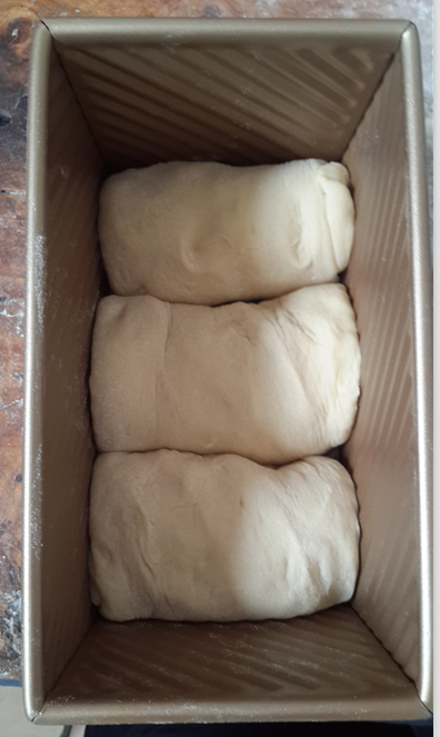 ,大家自己在家做的时候可以先测量一下土司盒的宽度,将面团擀的宽度比土司盒稍微窄0.5cm,这样放入后会相当美观滴,对了,我只有这次做两份太慌张了才出现的这种情况,以前我做的也是挺正好挺美的哦!