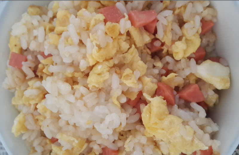 ,我今天虽然做了两个菜,但是我的菜里都加了辣椒啊,咋么办吗?灵机一动,对了,我不是蒸的米饭吗?给小子做蛋炒饭吧,继续开火……火腿切丁,热锅炒鸡蛋,重新起锅倒油放入米饭,最后将鸡蛋、火腿丁一起加入,好了,热乎乎想喷喷的蛋炒饭出锅了,终于可以开始吃饭了……