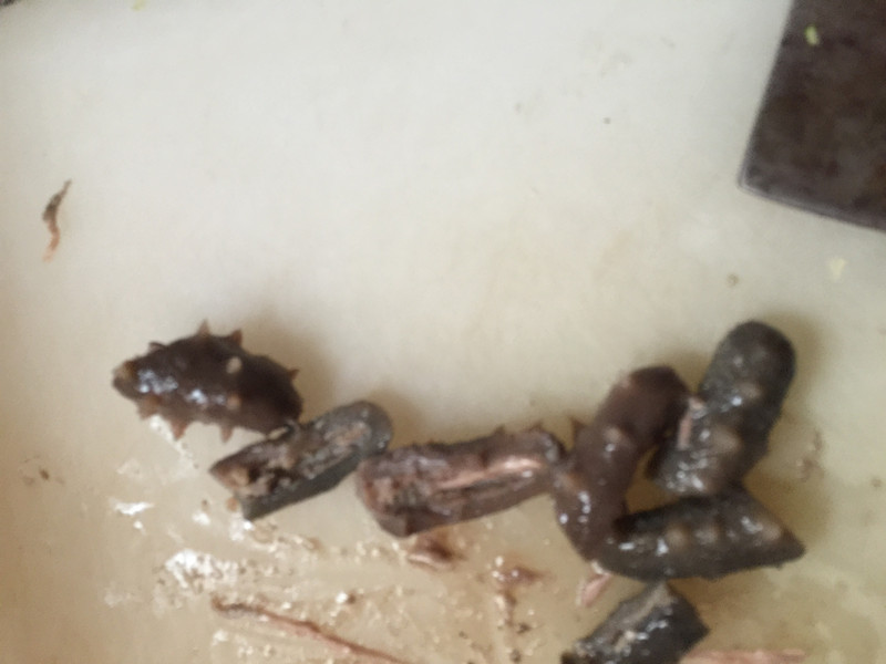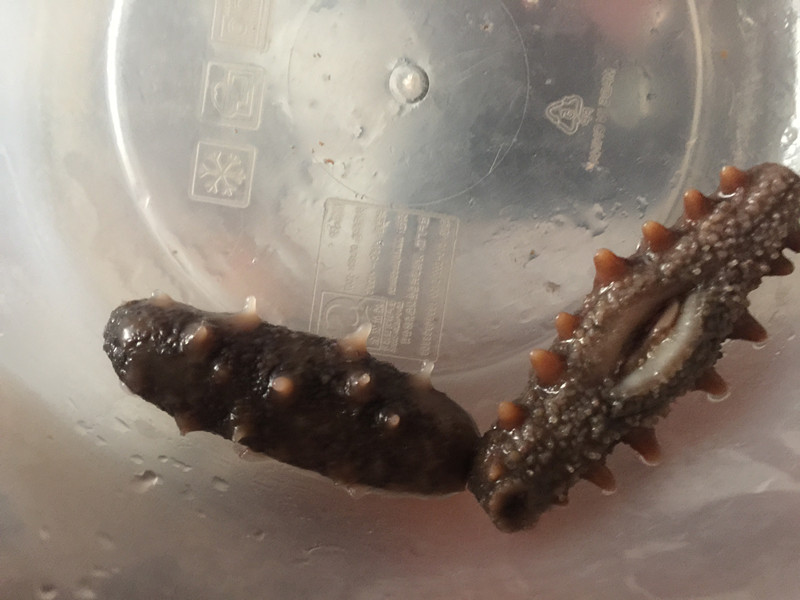 拿到快递当天,我就开始着手准备了,泡发是很重要的一步,于是找来纯净水,在室内常温饭盒中泡了两天,最后一天我又放在冰箱冷藏了一天,3天的时间应该差不多了,打开一看,好像没泡发成功,真是有点失望啊。 其实我这个当妈的一般都不下厨,有姥姥、奶奶做后盾展示厨艺,根本就指不上我,可是遇到这高大上的好材料,看来只有我来出马,但是由于经验不足,关键时刻还得老将出马。因为我们很少自己发海产品,所以一步步的还得有老人来指点,下手实操呀。 想了很多烹饪方法,熬汤、红烧、水煮……等等,最后还是决定给妞儿做一道酱香浓郁的葱烧海参吧。当我清理好海参肚内的肠子后,总觉得海参肚肚里都是黏糊糊的脏东西,但其实我看了其他宝妈的厨艺 后,才发现原来肚肚里面还有精华呢,可惜我全部都给扔了。 不管那么多了,还是看看油锅吧,最后在油锅中放入大葱,翻炒,不一会一盘子营养高,味道好的海参就出炉了。