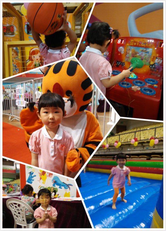 第一站:体育馆亲子嘉年华 同学送了我几张亲子嘉年华的票,我就带着宝贝和另一个同学一家一起去参加六一活动了。 走进体育馆,里面真热闹啊!我们先在门口让叔叔给我们一个气球,没想到叔叔竟然还给气球做了一个造型,一直可爱的小狗一下就做好了。宝贝心满意足地拿着气球走进了活动现场。工作人员给了我们一张表,上面列出了游戏项目,每个项目过关了就可以去盖章,集齐了章就可以去换礼品。 第一个项目是投篮。宝贝开始不肯玩,因为她之前没有玩过,后来看到其他小朋友站在上面玩,她就尝试了一下,很快就喜欢上了。过关后我就带着宝贝盖了第一个游戏章。 第二个项目是扔飞镖,这个宝贝可玩不了,所以我就代劳了,顺利地通过了第二关。 第三个项目是打地鼠,这个宝贝在行,因为我们有一个愤怒的小鸟的玩具,也是这样打打打的,所以宝贝轻松过关。 第四个项目是蹦床,宝贝平时在家里就喜欢在床上蹦来蹦去,看到这个项目简直热开了花,在上面玩了好久才肯下来。 游戏都过关了,我们和可爱的老虎合影后就去换礼物了!这里有好吃的棉花糖,丁丁糖,还有捏泥人等,宝贝换了一个公鸡造型的糖和一小块丁丁糖吃。 ![]() 第二站:甜品站 参加完亲子嘉年华,我们去了甜品店兑换了手机摇中的黄的不一样,两个小朋友拿到甜筒吃得可开心了! ![]() 第三站:七色花海 同学说要去梅岭看向日葵,于是我们吃过午饭就开车出发了。 七色花海有许多美丽的花儿,不过没有向日葵,哈哈,是同学搞错了。 花海果然名不虚传,一大片紫色的花,长得比人还高,瞬间让我想起了薰衣草,不过这个不是薰衣草,也不知道叫啥名字哦。 除了紫色的花,还有黄色,橙色,粉色的花,这些美丽的花吸引来了许多蜜蜂和蝴蝶。蜜蜂是大大的,毛绒绒的,蝴蝶也是好大一只的,宝贝之前可没见过这个大的蜜蜂和蝴蝶呢! 参观完美丽的花海,我们就回家了。 这真的是宝贝第一个开心的儿童节! ![]() ![]()
