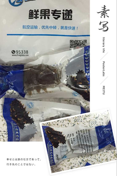 这还是头一回试吃申请成功,第一次成功试吃既然是海参这种高大上的食品。我是长江边长大的,小时候几乎都没吃过海鲜。现在交通运输快捷了,海鲜也是随处可见了。在这些海鲜中平时最常吃的无非是鱼类、贝类、虾类,海参还真是没吃过。虽然没吃过,但对海参还是有所耳闻:知道它是滋补佳品,营养非常丰富,而且适合人群广泛。所以当看到试吃成功的消息着实高兴坏了。 当打开包裹外包装,看到里面是2只包装完好的海蚨源即时海参。和海参一起的还有一个鲜果专递的保鲜袋。在收到海参的第二天,冰钰愛玥还特意发来信息温馨提示,如果不马上食用的保存方法。无论是海蚨源、快递公司还是冰钰愛玥都让我们感受到了他们在细节之处的尽善尽美,让我们体会到了大家的用苦良心。 拿到海参后,我就开始琢磨做法。并立即脑补大酒店里经过厨师的一双巧手精心制作的各种海参菜品,光想想就口水直流。擦擦口水、舔舔嘴唇,在看看周围的环境,才如梦初醒。一边摇头一边自言自语:像这种星级大酒店,经厨师精雕细琢的海参菜品,对于我有点遥不可及。于是我只好面对现实,走大众路线。