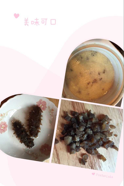 说到厨艺,我虽不能与星厨媲美,但做的家常菜也获得了朋友们的众多好评。不过对于从小在长江边长大的我来说,做海参还是蛮具有挑战性的,即便是即食海参。咨询了万能的度娘后,还是选择了海参小米粥。一是做法简单;二是这样我们一家三口都能品尝到。 先简单说说做法吧: 1、取适量的小米,清洗干净后,放入砂锅加适量的水用大火炖开锅后转小火。期间用勺搅拌以 免粘锅。 2、 将即食海参切丁备用。 3、 当小米煮到浓稠状时加入切好的海参丁和少许盐,再煮差不多10分就可以了。