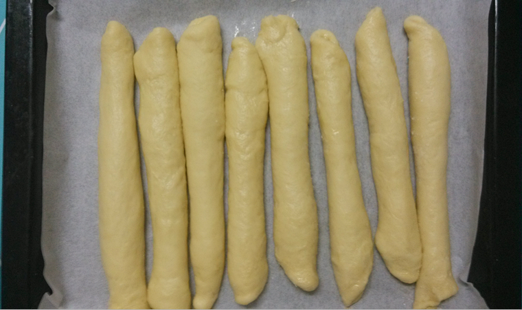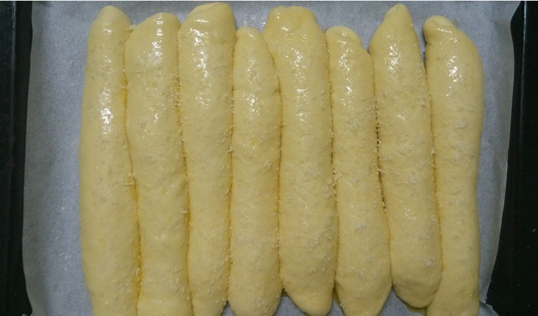![]() 昨天收拾整理的时候,发现了开封的椰蓉,看了一下保持期,还好没过期,那就赶紧动手做点什么吧。平时椰蓉经常拿来做的就是面包了,听了宝贝的一番话,也考虑想换个造型的面包了。打开我的小帮手,万能的“下厨房”,找到了一款椰蓉奶香排包,看着就觉得有食欲,尤其材料和做法都特别简单,赶紧动手了。 ![]() 材料准备: 面团材料: 高粉: 260克 水: 130克 鸡蛋液:35克 盐: 3克 糖: 35克 黄油: 22克 酵母: 4克 奶粉: 10克 裹入材料: 鸡蛋液: 35克 糖: 15克 椰蓉: 适量 注意事项:这是方子上的材料,而且注明了揉面比较粘手,建议用面包机揉面。可是俺没有面包机,材料中的奶粉也没有,于是自己稍微改了一下方子,没有奶粉那就用纯牛奶代替,用了20克的纯牛奶,这样水就减少20克。因为要把酵母溶到水里,所以使用的温水,把称好的温水倒出一半来溶解酵母。另外,宝贝们爱吃甜,所以我比方子多放了5克的糖,也就是40克左右,味道刚刚好,不算很甜。 1.除黄油以外,把所有材料混合揉成面团,然后再加入黄油继续揉面,盖保鲜模发酵,这是发酵好的面团。 在面团发酵期间,把裹入材料的糖加到鸡蛋液里搅拌溶化,备用。 ![]() 2.取出发酵好的面团挤压排气,分成八份,盖保鲜膜发酵15分钟。 ![]() 3.把面团擀成长椭圆形,刷上备好的加糖的鸡蛋液,均匀撒上椰蓉,注意不能撒太多,因为太多了可能很难卷紧。 ![]() 4.从侧面卷紧,成长筒形。 ![]() 5.全部卷好后,放入烤盘,再次发酵,直至面团两倍大。 ![]() 6.发酵好的面团表面刷上蛋液,均匀撒上椰蓉。 ![]() 7.放入预热170度的烤箱中层,上下火170度20分钟左右,上色即可。还未出炉,就能闻到椰香飘满屋,小宝就在烤箱旁边等着要吃呢。看看,是不是很诱人呢。 ![]() 撕下一块,开吃了。面包非常绵软细腻,清香可口,用来做早餐或小点心真是美味十足。又学到了一款新型面包的做法,小有成就感哦!