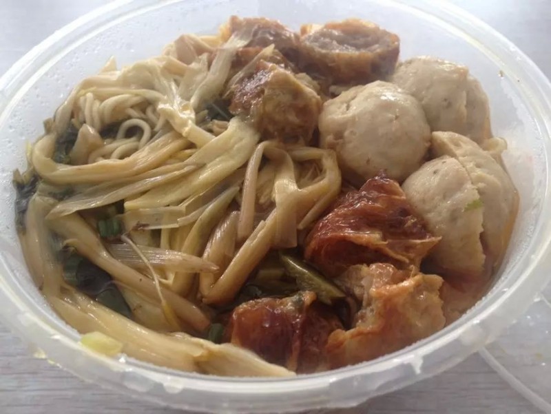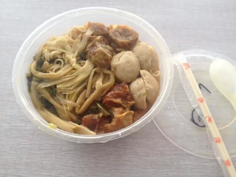 ![]() 这时同事推荐了位于附近小区门店的一家酸菜面馆,她们有去店里吃过,觉得味道不错,所以特地要了一张名片放在公司,以备不时之需。今天业务部同事一呼百应,大家的午餐决定就是这家了,于是全体叫了外卖。因为是酸菜面,顾名思义,里面是加了酸菜嘀,也更有助开胃。第一次叫的时候因为不知道还特地加了青菜,感觉有点多此一举。 ![]() 今天决定换换样式,点了面+鸡肉卷+贡丸+黄花菜,再加个1元打包费,一份12元。鸡肉卷3元也是同事推荐的,味道真是不错,就是贡丸两颗收2元有点小贵哪!也不知是不是因为大杂烩,酸菜没有那么酸爽,反而像是腌菜了,汤头倒是还行。因为叫了大碗的面,所以一份下来还吃得挺饱的。 ![]()