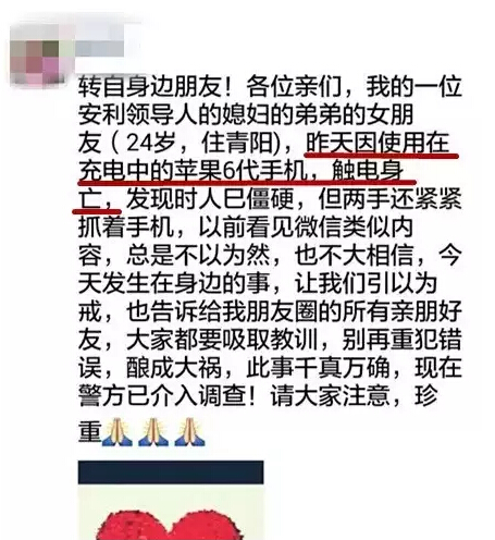 以后关于手机充电的问题,是真的要多多注意一下了!来看看具体的介绍吧! ![]() 这几天,很多人都被朋友圈的一条消息震惊了,“各位亲们,我的一位某企业领导人的媳妇的弟弟的女朋友(24岁,住青阳),昨天因使用在充电中的苹果6代手机,触电身亡,发现时人已僵硬,但两手还紧紧抓着手机……” 死者脚发黑 两只手有洞 昨天,记者几经辗转,终于联系到了死者的亲戚黄女士。 ![]() 据黄女士介绍,死者叫小婷,三明人,今年24岁,大学毕业后在晋江工作。悲剧发生在6月9日晚上9点多,当时小婷在晋江青阳男友家中,男友的母亲下楼时发现小婷趴在地上。“她就赶紧跑去把她翻过来。翻过来的时候手机掉在地下,充电器还跟手机接在一起,人接触还有点麻麻的,脚发黑,两只手有两个洞。手机充电器也有点黑。” 据了解,小婷当晚使用的是从香港买回来的苹果6代手机,但充电器不是原配的。 ![]() 三漏洞可致充电器漏电伤人 为什么标称电压很低的充电器会成为杀手?有媒体近期援引专家的说法称,在家庭用电环境中,有三个环节的漏洞容易造成手机充电器伤人的事故。首先是家庭三相插座中,地线没接,或者地线、火线、零线接错。其次,如果手机充电器插在了劣质接线板上,也会有很大的安全隐患。另外,图便宜使用劣质充电器,也很可能导致漏电,“因为它可能缺少漏电保护装置。” 避免手机充电器等电器漏电伤人,从根本上需要一个安全的家庭用电环境。在装修时,所有地线必须铺设到位,装修电工必须有电工证,避免接错。同时,应该购买合格的插线板、充电器,目前很多插线板都具备安全保护装置,可以在日常发生漏电的时候及时断电。 所以各位准妈妈们在给手机充电的时候一定要多多注意了!不是原装的充电器一定不要再用了~ 本作品未经作者许可不得转载,转载请征求作者意见。擅自转载使用,将保留追究其法律责任的权利! |