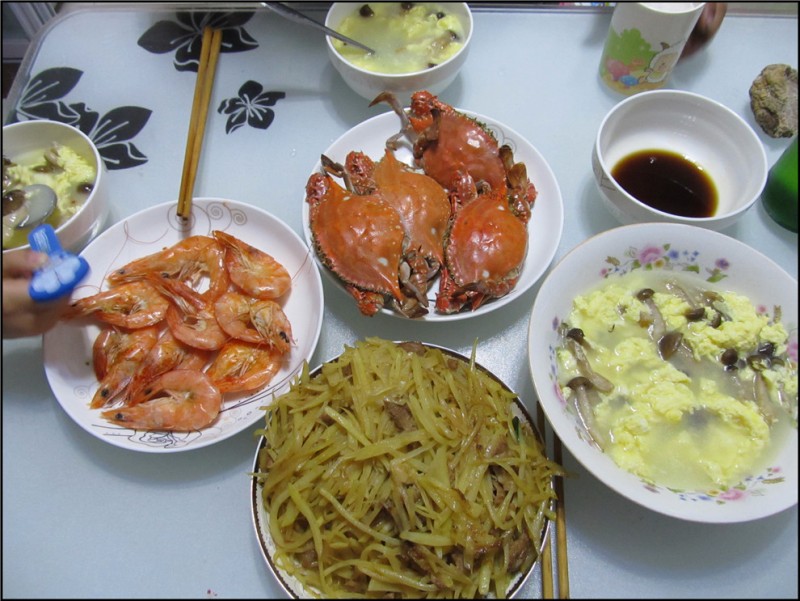 买菜的时候Aric还挑选了小蘑菇,他很爱吃蘑菇,而我会做的也就是蘑菇鸡蛋肉丝汤。把蘑菇提前洗好了放在热水里烫一烫,然后拿出来洗净抓干备用。油锅加热后,先炒肉,炒到了八分熟了就可以放入蘑菇翻炒。接着放入纯净水,当煮开以后,加入打散的鸡蛋,最后放入调料,就做出了Aric最爱喝的蘑菇鸡蛋肉丝汤,营养又好喝。接着炒土豆丝炒肉,对我而言,越是简单的菜,反而越是不会炒,像土豆丝炒肉,我就是边打电话询问老妈边做的。 当我全部做好了,螃蟹大虾也早就熄火等待出锅。Aric看的很欢喜,他时不时的帮我递碗、翻炒的,也是特别忙碌。平时Aric是很少来帮我的忙的,但是我知道,这次他是因为爸爸即将来到,所以积极了起来,总的来说,还是为了爸爸。当开门声响起,Aric飞奔大门,迎接他思念已久的爸爸。老公对于晚饭也是很惊讶,虽不如酒店的饭菜精致美味,但这让他有种被挂念的重视感,而且家绝对是他最温暖,最依赖的地方。晚饭吃了起来,父子俩有说有笑很开心,一家人如此才是最圆.满的。 ![]() 清蒸大闸蟹 ![]() 宝贝爱吃的大虾 ![]() 土豆丝炒肉 ![]() 蘑菇鸡蛋肉丝汤 ![]() 父子俩的开怀与团聚 ![]() Aric不爱吃螃蟹,但是对螃蟹却很是喜爱。 ![]() 老公吃了四只,中奖了一只有蟹黄。 ![]() Aric留下了一只玩了起来。 ![]() 来看看清蒸大闸蟹吧,有没有被诱惑到呢?