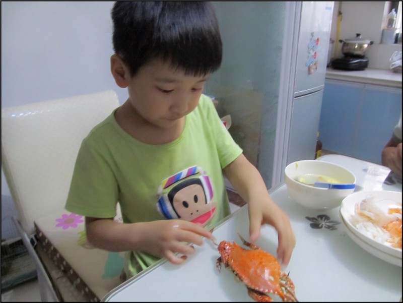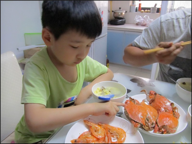 想念爸爸的Aric终于把爸爸盼回来了,早在知道爸爸要回来,就和妈妈一起为晚饭做准备,希望可以做一顿丰富的晚餐,来为爸爸接风洗尘。我特地打了个电话给老公,知道他还需要一个小时到家,就赶紧领着Aric进入厨房。提前买好了一些菜和肉,还有准备好的螃蟹、大虾,我想,这一顿应该可以满足Aric的要求了吧。果然Aric看到了螃蟹,就称赞说妈妈准备的很合适,虽然他不爱吃螃蟹,但是却知道,爸爸是最爱吃螃蟹的,他觉得爸爸会很高兴。 螃蟹在做之前可是青色的,Aric看到妈妈把螃蟹放在锅中蒸,还有大虾放在中间,这样就可以一直蒸了。Aric站在了旁边,盯着螃蟹看,他问:“为什么吃过的螃蟹都是红色的,就是大虾也是红色的,可是蒸之前是青色的呢?”我告诉他,你可以自己观察,因为妈妈告诉你,不如你自己眼见为实来的更真实,还能看看螃蟹的变化。所以Aric一直盯着看,倒也蛮稀奇的。而我就趁着他在旁边帮我照顾螃蟹和大虾,准备其他的饭菜。