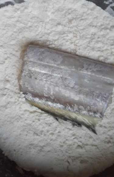 ,加入蛋清后拌均匀,然后将带有段放到干面粉中滚一圈,使其均匀的沾满干面粉,然后码放到面板上