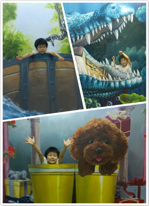 孩子开心的在里面选择自己喜欢的场景,我仔细研究了一番,终于发现了特色。这里的3D体验和别处的还真不太一样。其他地方的3D基本上对拍照者的位置和姿势有特殊要求,只有按照要求拍出来的效果才好,这是因为场景完全都是平面的景。而这里的3D效果除了平面的景,还有一些立体的布局,也就是互动道具,借助这些互动道具,更容易拍出3D的效果,而且拍照的舒适度也更好一些。 ![]()