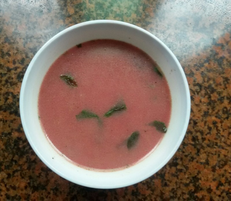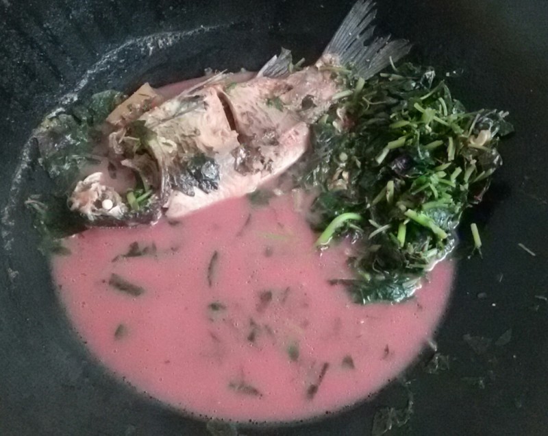 昨天煮的鲫鱼汤,加上红苋菜煮,结果煮出来的汤不是奶白色的,而是粉红色的,结果孩子竟然抢着喝了一大碗。