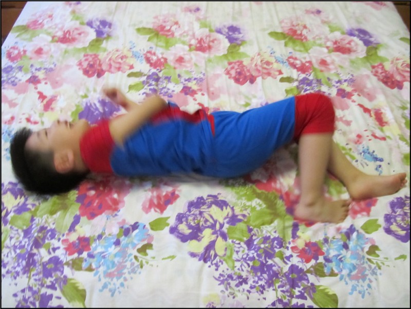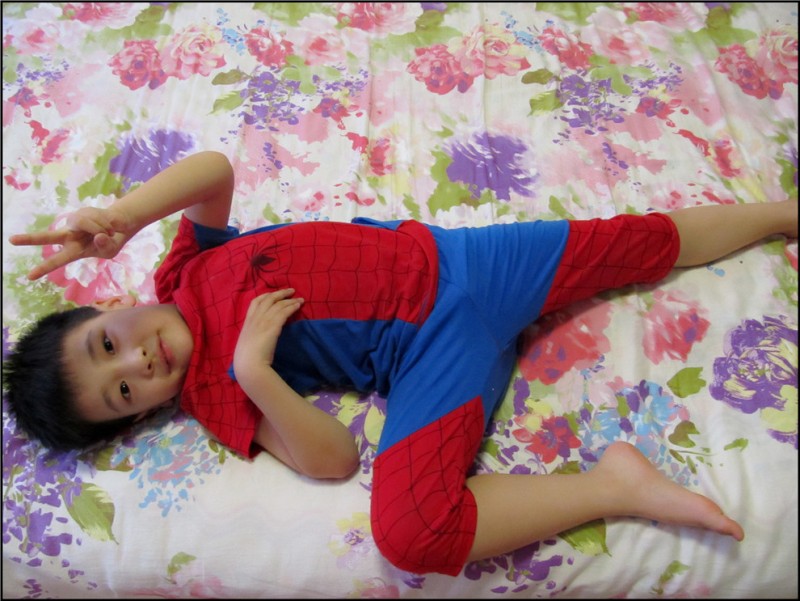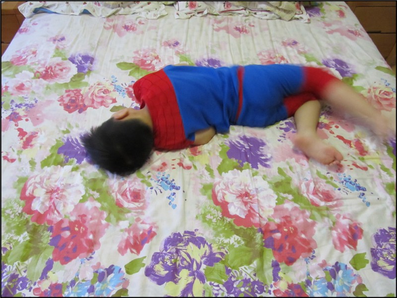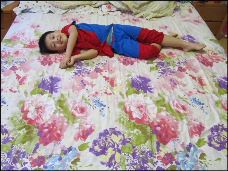 晚上做饭大扫除,一阵的忙活,Aric也来帮忙,拿着那电蚊拍到处乱转,说要抓捕蚊虫。放任了他的“帮助”,因为Aric并没有因为我的忙碌而闲着说去看动画片或者玩玩具,哪怕只是在他认为这是帮忙,在我认为他这是玩的前提下能够动手,所以也要提出表扬。还别说,偶尔真能听到“啪啪”的声音,因为哪怕厨房再干净,偶尔也会有小飞虫,真被他抓住了一两只,小家伙顿时倍感骄傲。于是给他出了一个抓捕大蚊子的任务,可惜Aric是怎么找也找不到。嘻嘻,因为我是不允许家里有蚊子的呀。 换洗床单的时候,Aric看到了我铺了新洗好的床单,紫色的大花让他觉得很舒服。其实对于这种花样的床单,我也是特别无奈的啊。当时买的时候是和老妈一起去的,大家也知道,老人家嘛,就是喜欢大红大紫的,说是过日子就如床单一般,过的大红大紫。我是个乖乖女,自然会听从老妈的意见,家有一老如有一宝嘛,听老妈的准没错,反正铺什么花样的不是铺啊。而且意外的是Aric也特别喜欢,可惜他的是蓝色床单,不能换成这种大红大紫的,于是Aric就经常跑到我们屋里来玩,躺着休息。