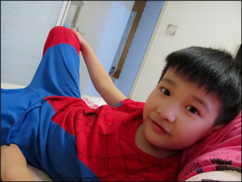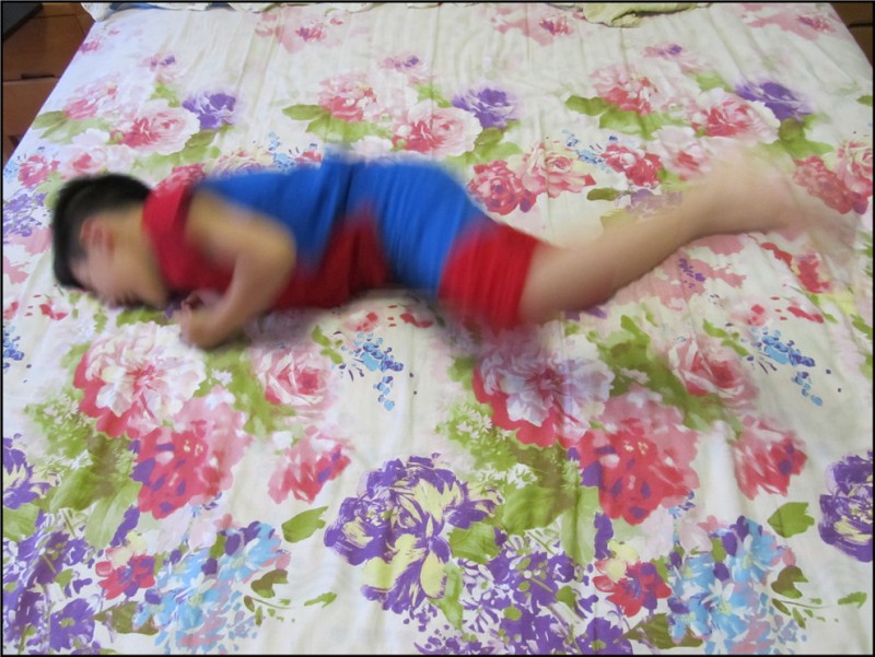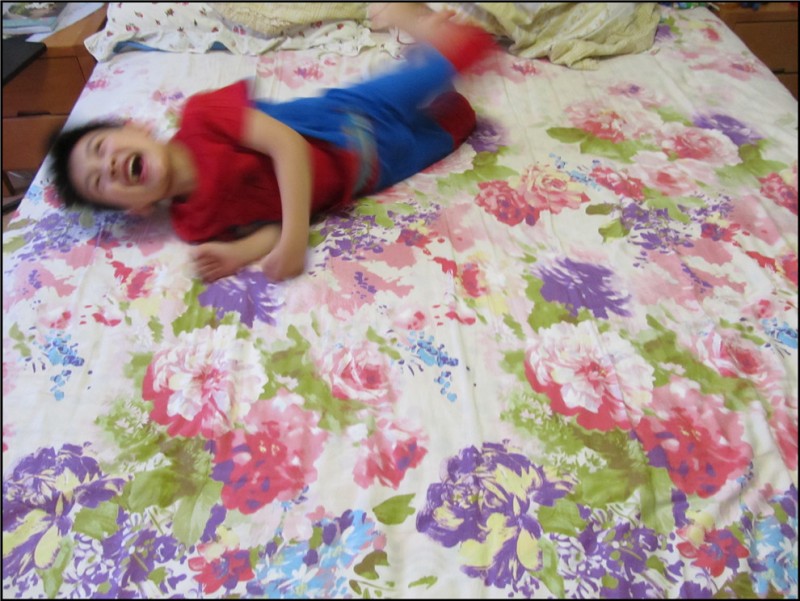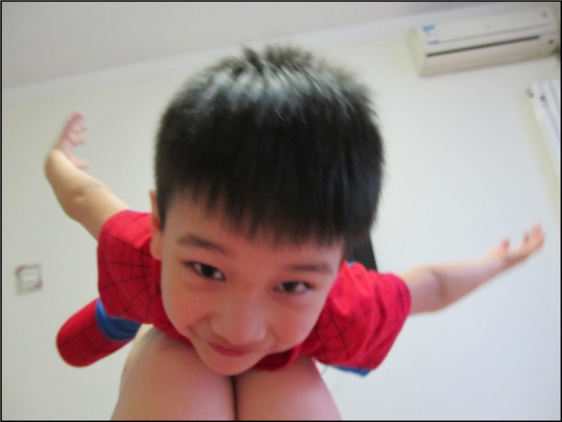 这时Aric就想在床上玩翻滚游戏,可是我立马反对,洗个澡先吧,否则不得弄脏床单啊。Aric简单的冲了澡,穿上了新洗好的他的最爱蜘蛛侠的衣服,立刻蹦到了床上,玩了起来。我看着好玩,喊着:“翻滚吧,土豆!”Aric立马滚了过去,又滚了回来,逗得我是哈哈大笑。一会儿Aric才反应过来说:“妈妈,我不是土豆,我是猴子,你应该喊翻滚吧,猴子!”好吧,那么翻滚吧,猴子!于是小猴子继续翻滚,边翻滚边喊着“翻滚吧,猴子!翻滚吧,滚吧!”哈哈哈,快笑坏我了! Aric还特别爱玩一个游戏,就是我躺在床上两腿并拢做运动,而Aric就坐在我的小腿上,抱着我的大腿,任由我做着运动,他就像斗牛士一般,死抓着不放手。而往往到这个时候,我都累的大喘气,这小子越来越大了,我这纤弱的身子骨可经不起这胖小子的玩啊。玩了几轮Aric也发现了妈妈在喘气喊累,就停了下来,帮我锤锤腿,问我还累吗?我感动的说不累了,结果Aric一下子又翻了上来,让妈妈再玩两局。真晕这小子,玩的时间久了,大家都累了,躺在床上,Aric靠在我身上和我聊天,这种气氛真的好温馨啊。 ![]() 在翻滚中的猴子 ![]() ![]() ![]() ![]() ![]() ![]() Aric最喜欢的一个游戏,坐在妈妈的小腿上,由妈妈做运动,他还能玩飞起来和斗牛的游戏。 ![]() 玩过以后,我们躺在一起聊天,这种感觉很温馨,也很快乐。