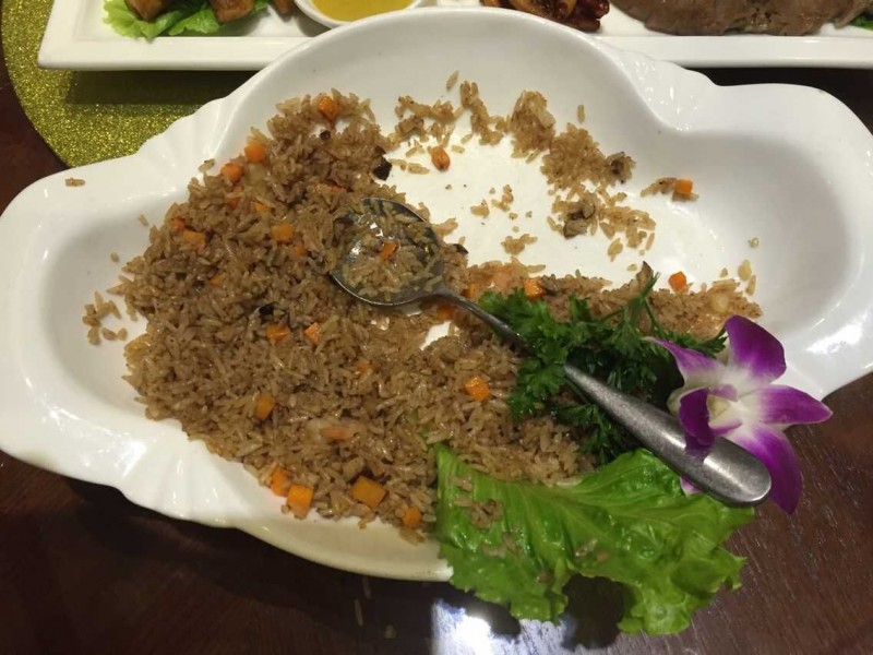 蝴蝶轩的环镜还不错,我们在之前就预约好了,所以都不用等位子,之前我们吃了鹅肝虾仁炒饭很不错,还有咖喱土豆牛腩也很好吃,这样我们就点了这两个菜,点点就先吃起来了,点点上次就吃到了这个炒饭,就很喜欢吃的,这一次点点依然很喜欢吃这个炒饭,吃了两碗,剩下的就我们几个吃了,每人一小碗,吃吃味道很不错,尤其是里面的鹅肝细腻,虾仁鲜美,味道很不错。
