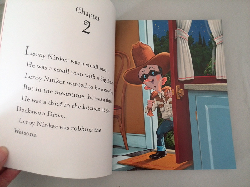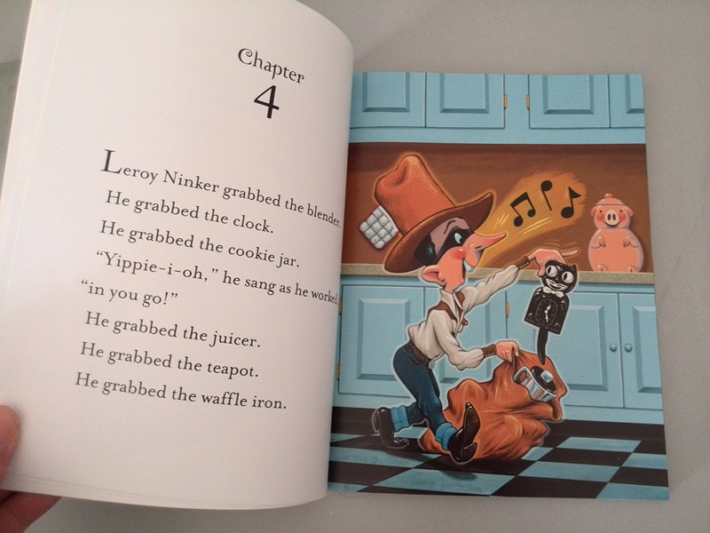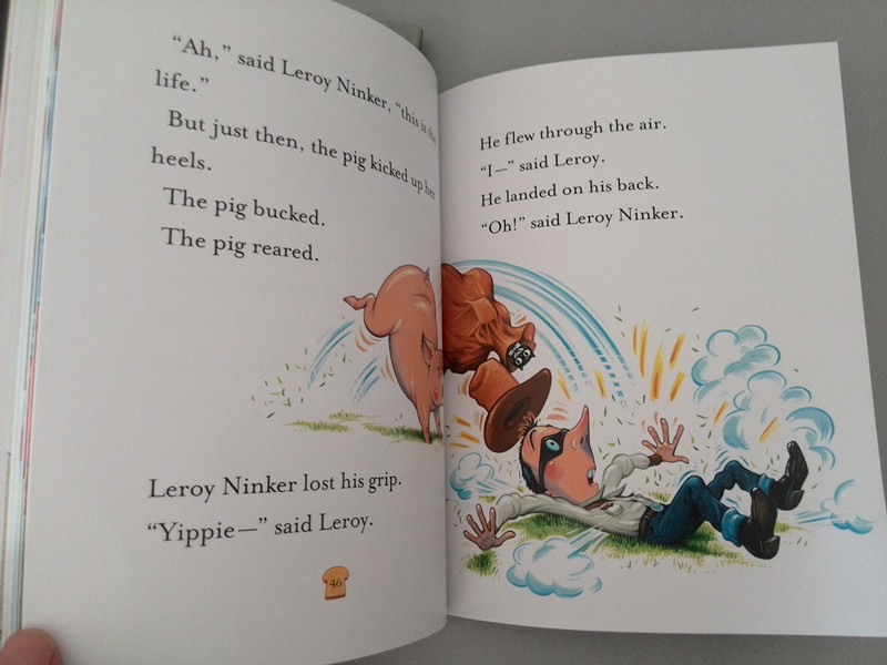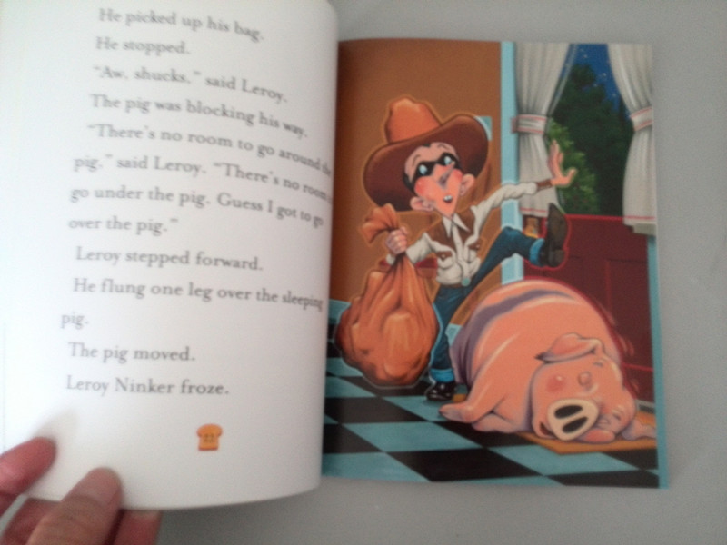 ![]() 呵呵,头一次完整地阅读了一本全英文的书籍,真是很吃力啊,虽然是给孩子的读物,但对于我这个学了十年英语而且现在还在使用英语的人来说还是有很多的单词不认识,但这本书的好处是你能通过它的插图结合着英语文字来看就基本能弄懂它的意思了,整本书的布局基本都是一页文字配着一页插图,相信这对于词汇量有限的小朋友们来说是一个极大的帮助。当然对于我来说,我是认认真 真地一个单词一个单词地去看了整本书的,正好还可以借机丰富一下我个人的词汇量。 ![]() 这本书的质量很好,纸质很厚实无异味儿,字迹清楚,字体大小合适,很适合孩子阅读,插图也很棒,迎合了孩子们的品味儿,希望孩子们能喜欢这样一套带有异国风情的书籍,感觉一下异国书籍的魅力。 ![]() ![]() 整本书就是写了小猪梅西的一个小故事,因为嘴馋爱吃烤面包,听着烤面包机的声音闻着烤面包的味儿从梦中醒来却碰到了正好在她家偷窃的小偷LEROY,而这个小偷LEROY又有西部牛仔的情结,由此而发了一系列好玩又有趣的事情,由于小偷急着出逃,但却被没吃到烤面包又犯困在地上睡着的小猪梅西挡住了去路,想抬脚迈过小猪梅西正好被醒来的梅西驮起来跑了,小偷LEROY觉得自己变成了西部牛仔,后来被梅西颠倒地地上,因为一直闻到烤面包和黄油的味道却一直寻找不到,最后小猪梅西因为循着味找到了小偷口袋里面的糖果从而坐到了小偷LEROY的身上津津有味儿地吃了起来,因为奔跑从而惊动了四邻,把自己的爸爸妈妈及周围的邻居从梦中吵醒,而且还惊动了消防部门及警察局,最后的结果就是小猪梅西误打误撞地抓住了这个小偷LEROY从而成了家喻户晓的一名小英雄,上了报纸新闻,是孩子们喜欢的故事情节,相信孩子们看了一定会哈哈大笑的。当然阅读英文读物最大的好处就是能帮助孩子们记一些日常经常用到的词汇,扩大孩子的词汇量,所以如果家长和孩子能坚持的话,经常阅读这样的英文绘本对孩子是非常有益的,而且还能提高孩子学习英语的兴趣。所以如果可能的话,我想有时间把这一套书全部买下来让我家宝贝看一下。不过以我家宝贝现在的英语水平,应该是一个人读不下来的,她顶多是看看插图明白意思,所以最好还是有大人陪读比较好,这样效果会更好一些。 ![]() ![]() ![]() ![]() ![]() ![]() ![]() ![]()