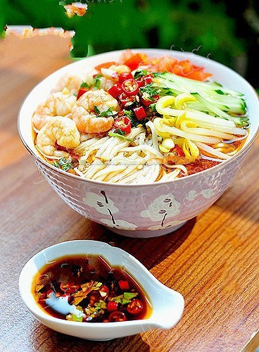 2、锅内烧开水将生面条煮熟。 3、煮好的面条用凉水冲冷后,浸入冰开水中5分钟后沥干水份。 4、将虾仁及黄豆芽氽烫至熟,同样浸入冰开水中过凉,捞起沥干水份。 5、用生抽,陈醋,糖,蕃茄酱,柠檬汁,凉开水,辣椒红油,芝麻香油,生蒜蓉,红椒圈,香菜碎在 碗内调匀即成凉面料汁。 6、将面条放入碗内,表面码上熟虾仁,黄瓜丝等,再淋上凉面酱汁即可食用。