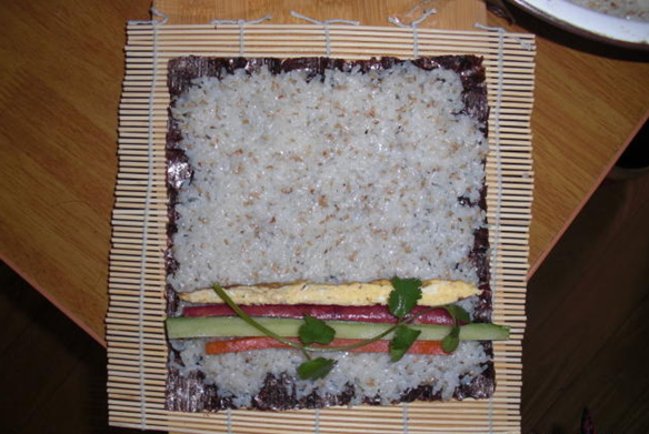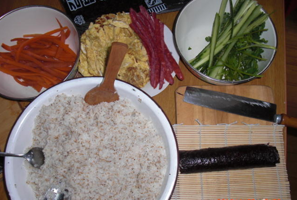 我家又恰恰是不爱吃青菜,不爱吃紫菜的那种,所以真的希望这种混合打法,可以让宝贝有一种新鲜的感觉,可以多尝试一些平时不吃的蔬菜种类,那我可就要乐坏了。 首先做准备工作,焖上一锅米饭,煎荷包蛋,煮胡萝卜。 材料要有紫菜,黄瓜,腊肠,鸡蛋,胡萝卜,香菜,芝麻,香油。(因人而异)喜欢吃什么就放些什么!芝麻,香油是放在米饭里的!对了还有盐! 准备工作好了,开始做寿司了!!!