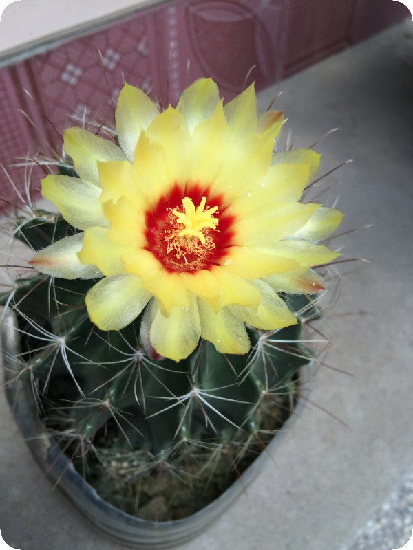 仙人球的品种有很多,开的花儿也不太一样,记得小时候奶奶养的仙人球,开出的花朵下面有长长的柄,而这次的花朵,几乎都是贴着仙人球的。仙人球花朵的颜色也有很多,白的、粉红的、红的、黄的、绿的都有,我家开的这些全都是黄色,奶奶以前养的好像开的是白色,总之花样很多,很漂亮!!仙人球生命力很强,大的上面结出了小的,掰下来放在土中就能成活,等我回北京的时候掰一个小的带走