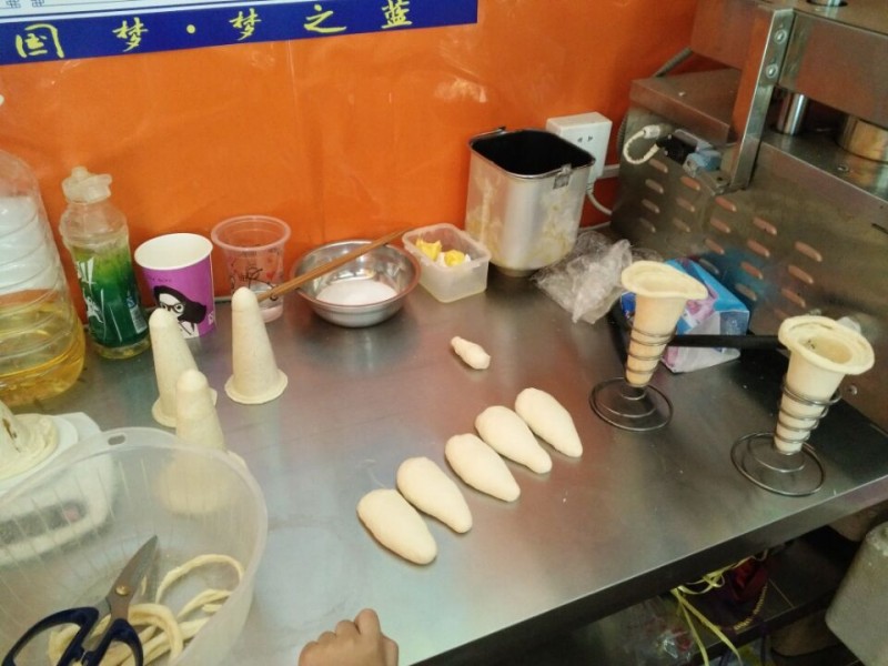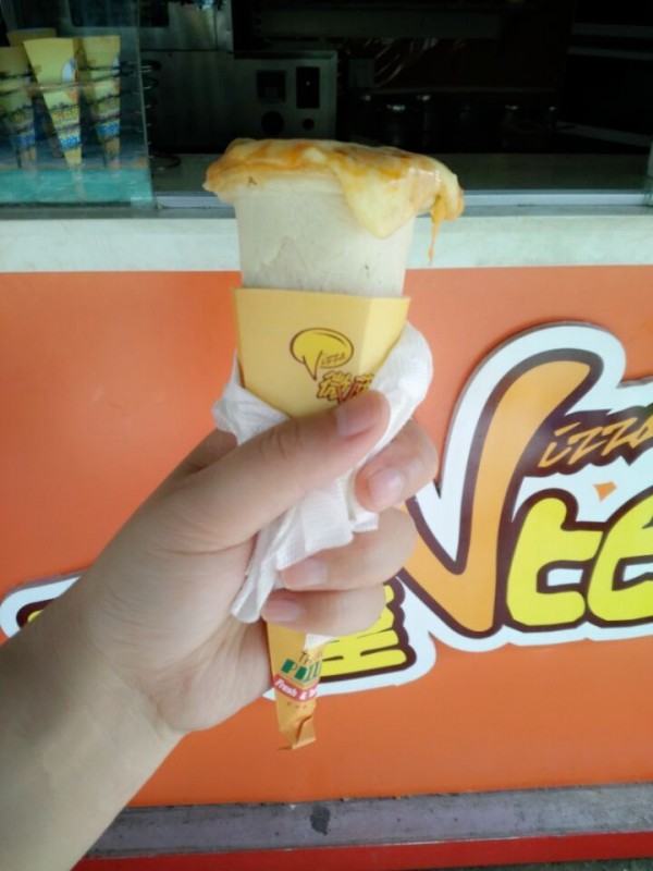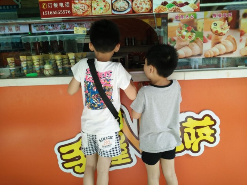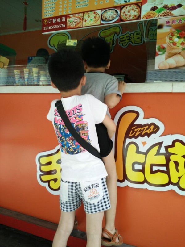 今天老妹带着介然来玩了,中午自然而然的要请他们吃饭,不过吃什么还得老妹说的算。偏偏老妹又是个要求不高的女人,竟然选择吃麻辣烫。主要还是老妹从小就爱吃麻辣烫,和我完全是不同的喜好,还记得以前上学的时候,每次经过少年宫,老妹都得去买点麻辣烫吃,而我就在旁边看着,也没有想吃的欲望。长大后不止老妹还这么喜欢麻辣烫,连介然也随了老妹。反观Aric就对麻辣烫一点儿兴趣都没有,他觉得那么多东西放在一起煮,很不卫生。所以今天中午吃老妹吃麻辣烫的同时,Aric却选择买了其他的外卖,例如手握披萨,一种非常流行,也非常适合小朋友吃的披萨。 在手握披萨店门口,Aric就为自己选择一款适合自己的披萨,可是这时才发现,他竟然不要加青椒、洋葱一类的蔬菜。老板说只有肉的披萨做不出来,令Aric失望极了,只好退而求其次加一点蔬菜就好。不过也因为我们来的时间比较早,这个时候披萨饼都还没有做好呢。Aric就和介然小朋友站在旁边盯着看,研究手握披萨是如何做成的。现在科技这么发达了,就连我也忍不住惊叹人类真是因为科技发达而越来越懒惰了啊。就看到老板揉了几块面,然后扔进了所谓的烤炉中,当几分钟过后再拿出来的时候,就已经是手柄式的披萨饼了,这时再加入各种配料,然后放入烤炉中烤制不到十分钟即可。