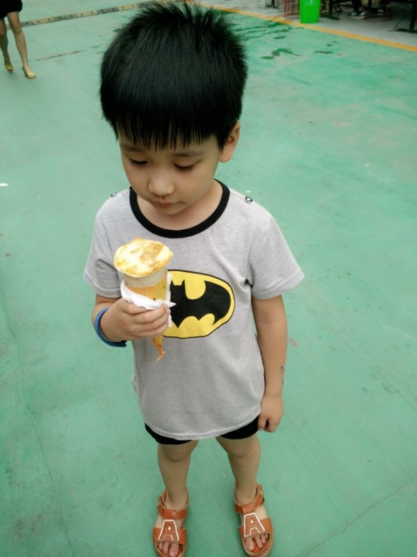 因为Aric是个比较喜欢问的孩子,所以他总是滔滔不绝的和老板聊着天,聊着披萨的制作。哥哥赶紧在后面捂住了Aric的嘴巴,就怕Aric打扰到了老板的制作。看的我是心惊胆战的,因为小孩子哪懂什么手劲啊,就看着介然捂着Aric嘴巴的同时,顺便连鼻子也一起捂了起来。刚开始Aric还觉得挺好玩的,时间久了就有点憋闷了赶紧拉开哥哥的手。当时我也没说介然什么,后来告诉介然,这样捂着很容易引起窒息,所以这样的小游戏以后最好不要玩了。就连Aric也在旁边郑重其事的告诉哥哥,当时他都快憋死了,很难受的。好在没有当时批评介然,事后说介然也不会太介意,而且很容易接受。 等手握披萨做好了,Aric高兴的拿在手里,说就像吃冰激凌一样。然后我们又找到了坐等在麻辣烫店的老妹。除了Aric自己吃着手握披萨,喝着梨汤,我们都在吃着麻辣烫。像老妹母子俩是经常吃的,我这么多年来还是第一次吃,很新奇,发现果然很好吃。不过回到家后还是被老公批评了一顿,这人就爱管着我吃,不能吃太辣的,不能吃路边摊,不能吃太凉的等等,呜呜,我这悲催的美食命运,被老公和Aric管的死死的。也因为今天有哥哥一起玩、一起吃饭,Aric的心情特别好,最重要的是没课想怎么玩就怎么玩,这可是孩子最期盼的,也是最喜欢的了。