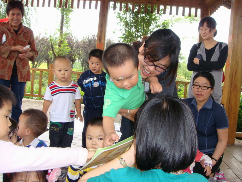 6月19号一大清早就把宝贝叫醒,对宝宝说:“宝贝快点起床,我们要去听故事了。”宝宝很快从床上爬起来,对我说:“妈妈,我去和小朋友们换书看,对吗?”冒似还蛮懂事的,呵呵。吃完早饭我们就出发了,赶在9:30之前到了江大东门,然后在北晨妈和文宝妈的组织下大家一起去太湖边,我们坐的芊芊家的车,在这里也表示感谢。