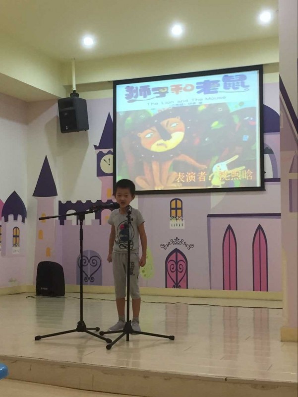 点点是十二号,所以他一点也不着急,慢慢看着小选手们的表演,耐心等着,我和他说话也不知道听进去没有,我交代点点讲故事两手平放,先要自我介绍,表情动作都不要忘记了,点点说知道了。轮到点点表演了,一开始的几句话都很好,讲了一段以后,声音慢慢提高起来了,狮子的声音响亮,小老鼠的声音比较低,就是忘记了几句话,不过也不影响故事的内容,还微笑了,生气的地方语速也可以,讲完了以后还问我怎么样,我说很棒。这一次点点的分数还是很高的,九点四一分,我觉得可以进入前五了。