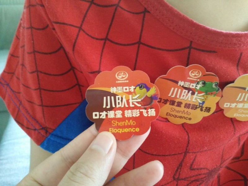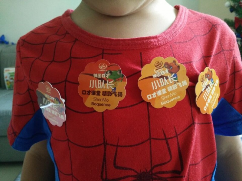 周六上午有一节口才课,平时Aric都很淡定,可是在这节课之前Aric却很激动。因为他终于积攒了4个小队长的勋章,来找老师换取他喜欢的礼物了。Aric上了口才课已经一个月了,每周二四六去上课,而在第二周开始Aric就已经开始获得小队长的称呼。别看这次Aric积攒了4枚勋章看起来挺多的,实际上能拿到勋章是很不容易的事情。要求每次的学习要带一支队伍,而这支队伍获得了第一名才可以由队长得到小勋章的奖励。虽然Aric现在说话还是有点萌音,但是他特别认真的去学,而且他非常有团队意识,每次都能获得胜利,一个月的时间终于攒到了4枚勋章。 另外还有积分的奖励,不过Aric都给放了起来,说等到以后再换东西。而这个勋章只需要积攒4枚就能换一个礼物,所以Aric还是觉得先用这4枚比较合适。早晨去之前我在洗漱,让Aric把需要带的东西装好,顺便把水壶装好水,Aric应了一声后就没有了动静。等我出来一看,竟然发现Aric把四枚勋章都挂在了衣服上,乍眼望去,好家伙,这孩子活脱脱一个荣誉获得者啊。Aric哑然失笑,问他这是干嘛?Aric笑的合不拢嘴说放在口袋里会丢,所以挂在衣服上最保险。真晕啊,人小鬼大,怎么什么都懂呢,不过我还是蛮好奇他这样走出门,会不会获得很多的回头率呢?