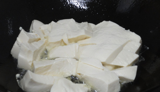油锅烧热以后,就把油倒进去,放入大葱,锅子就开始滋滋滋的响起来,冒烟了,大葱的香味出来了,然后放入豆腐,正反两面都要煎一下,这样吃起来会很香的,接着我就放一些老抽酱油和海鲜酱油,放入水,开小火,豆腐就在油锅里冒泡了,小火烧了五六分钟,我就放入一大勺子白糖,把豆腐翻转一下,这样烧出来的味道会很鲜美,又是小火烧了三分钟,这样就可以起锅了。期间手机没在身边,忘记拍照了,最后才拍了一张照片。