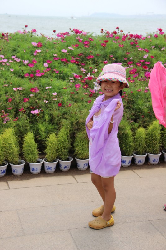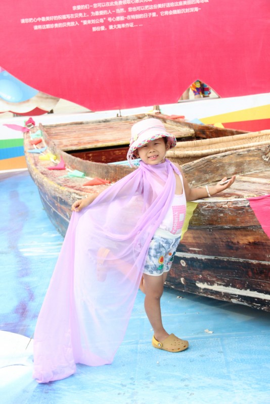 早上起床,听说海上雾很大,怕是不能登岛,但是过了一会后就说雾散去了,于是我们赶快去吧。在门口处有卖这种纱巾的,老爸买了好几个,说是给我们一人一个,父亲还真是用心呀。宝宝看到后可高兴呢,立刻选了一个当披肩玩了起来。