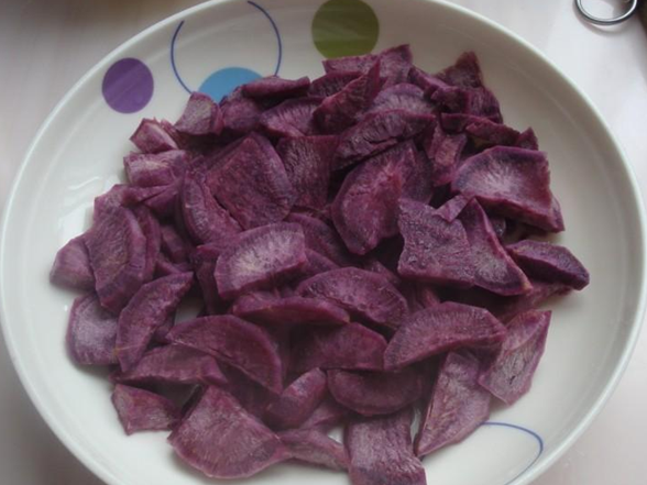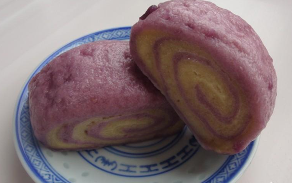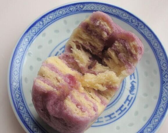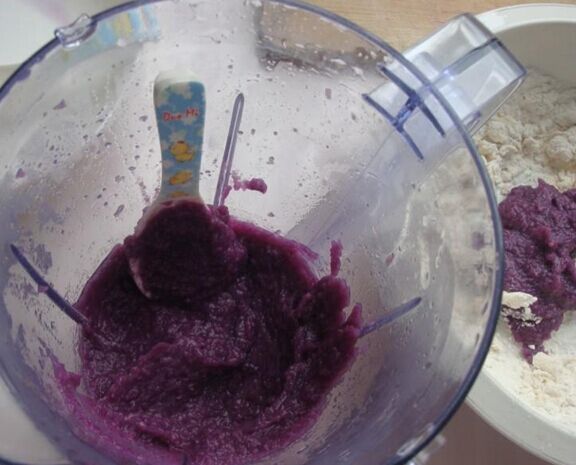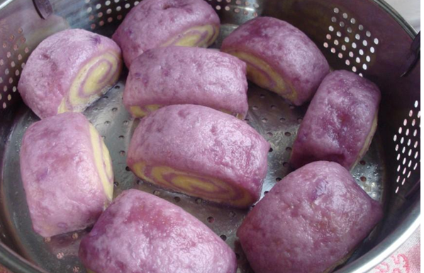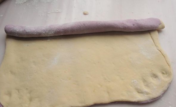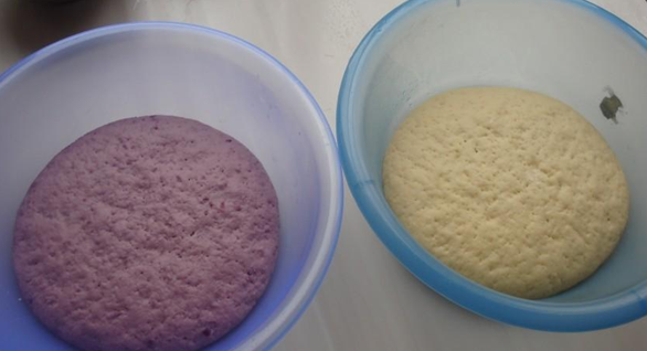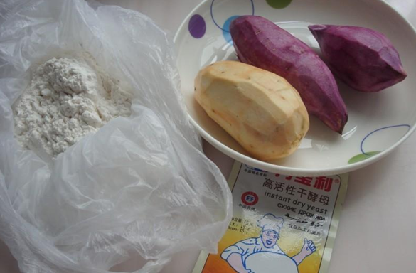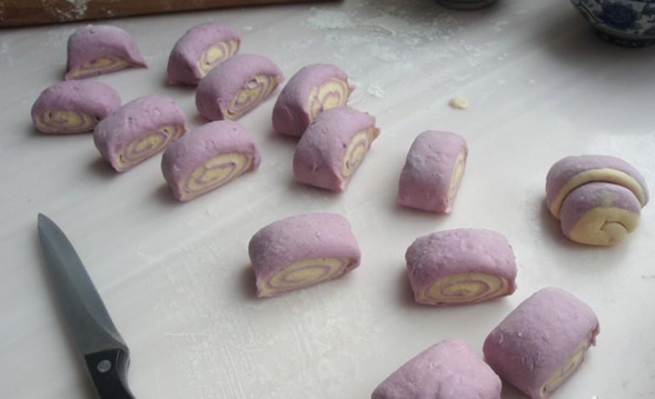 首先按照婆婆说的,我准备了材料,有紫薯、地瓜、面粉、水和酵母。然后简要听取了婆婆讲述的步骤和方法,大概是这样的:第一步,我先把两种番薯分别去皮切片,再放入微波炉中用高火加热5分钟左右,这样就可以足够松软了,然后拿出搅拌机把这两种搅拌成番薯泥,在兑上酵母用36度水搅合搅合,再分别跟面粉紫薯、地瓜揉成团,放到阳台灯温度高的地方,大概发酵大概1小时以上,然后先后取出揉成团后擀成稍厚的面皮,最后把两张和在一起擀成厚大约4CM左右的厚片,擀好后,慢慢卷起,用到切出想要的形状,再次发酵30分钟左右。