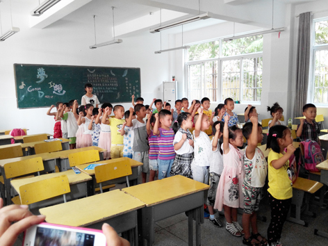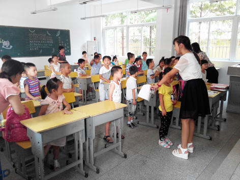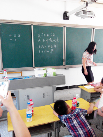 一进教室,里面挤满了人,来的家长有的在填写学籍单,有的在聊天,因为正好认识的人在一个班级,肯定开心呀。我们的学籍单是在家的时候就已经写好了,所以就不需要在写了。只要给他们的班主任看一下就可以了。学籍单交给老师之后,家长就要离开教室了,因为所以的小孩子都要从座位上站起来,然后并列成两排,一起宣个誓。孩子们的声音非常哄亮,宣誓很有模有样的,我们家长在外面看着都不想走,只愿意眼睛围绕着自己的孩子转悠。