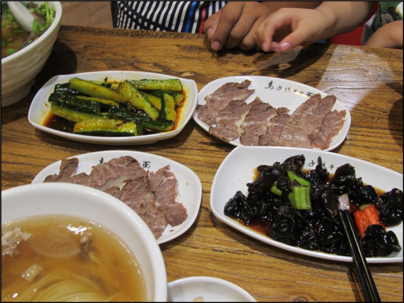 在这样一个美妙的假期里,我的懒惰因子作祟,决定带着那两只出去吃饭喽。吃什么的时候让我纠结万分,决定去和谐广场逛一逛、看一看。不过还没走到和谐广场就突然想起Aric六岁的纪念照还没有选照片,又去选了一番,时间耗费了一个小时,到达和谐广场的时候已经七点多了,饿的前胸贴后背,赶紧凑凑合合的随便吃了算了。不过老公今天的肠胃不好,所以最终决定吃面,而在我们的面前有两个选择,一个是味千拉面,一个是新开业的马子禄牛肉面,这个还真没吃过,应该很好吃吧,所以去尝尝吧。 一个双人套餐是68元,还是挺实惠的,包括了面、牛肉、小菜和饮品,老公选的是粗面,我的是细面,因为晚上的我不能多吃,就和Aric吃一碗,经济又实惠,哈哈。这种面是单独的一碗,应该是拉面,因为我吃到了拉面的味道。实际上我最爱吃的是味千拉面,不过在这样一个阅兵的时刻,我要抵制日货,嘿嘿,所以不吃味千拉面了。其中还有单独的牛肉,因为我们的是双人套餐,所以有单独的两盘牛肉,这个牛肉很不错呦,绝对纯正的牛肉,就连Aric这个不爱吃牛肉的小朋友,也是硬生生的吃了一盘。