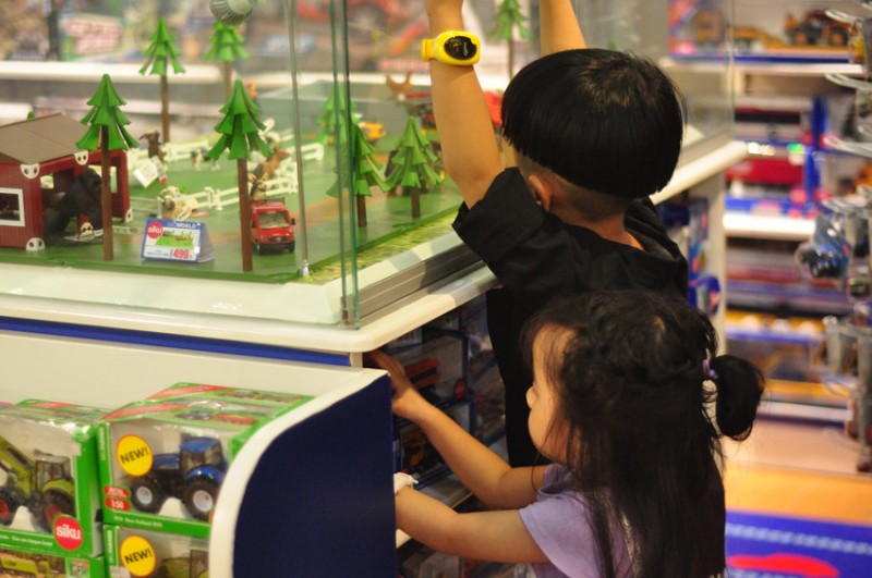 采购礼物篇: 生日礼物,当然是重中之重,小时候的我没过过几次像样的生日,于是现在每一年,我们都会想破脑袋给孩子买什么?哞爸今年就比我好过一点,因为他早前就答应给儿子买的电话手表已经提前一周就送到儿子手中。还买了哞哞喜欢的黄颜色,戴上可靓丽了,这下俩娃不再争抢了,纷纷给爸爸打电话,可忙坏了工作中的哞爸。哞爸也乐意享受孩子们围着他的赶脚。有了定位手表我一人带着俩娃去采购我要送给哞哞的礼物也so easy,在看了众多的玩具之后哞哞选定了这套农场玩具,我一看质量很棒,大品牌也信得过,两个孩子玩过家家也不错,开发脑力。这次估计我比哞爸送的礼物更受孩子们欢迎了吧?晚上来个投票啥的。买完玩具哥俩还要坐过山车,这可是第一次让哞哞带着妹妹去坐,下来之后哞哞说幼幼起初很害怕,他一只手搂着妹妹,幼幼就不再怕了,按下快门的瞬间连我自己都被感动了,两个孩子互相依靠,哥哥保护妹妹的情景一直在我脑海闪现。