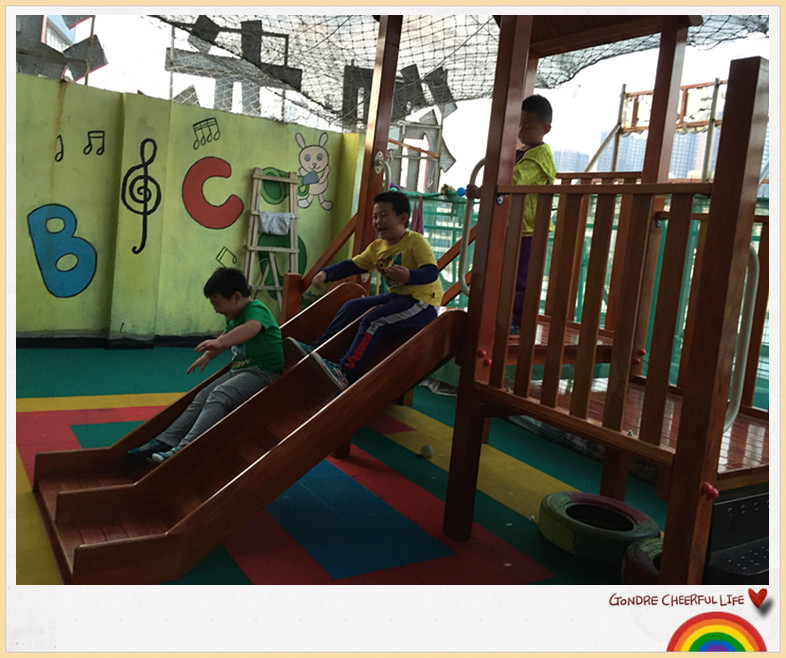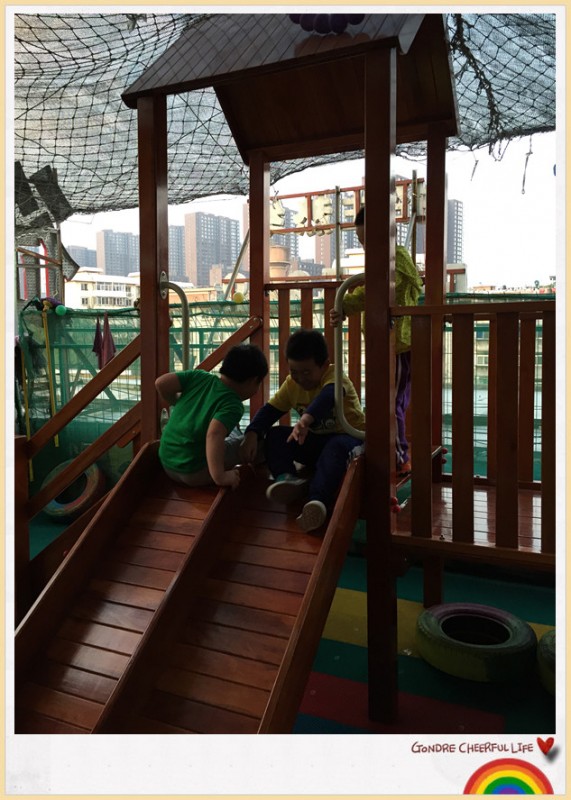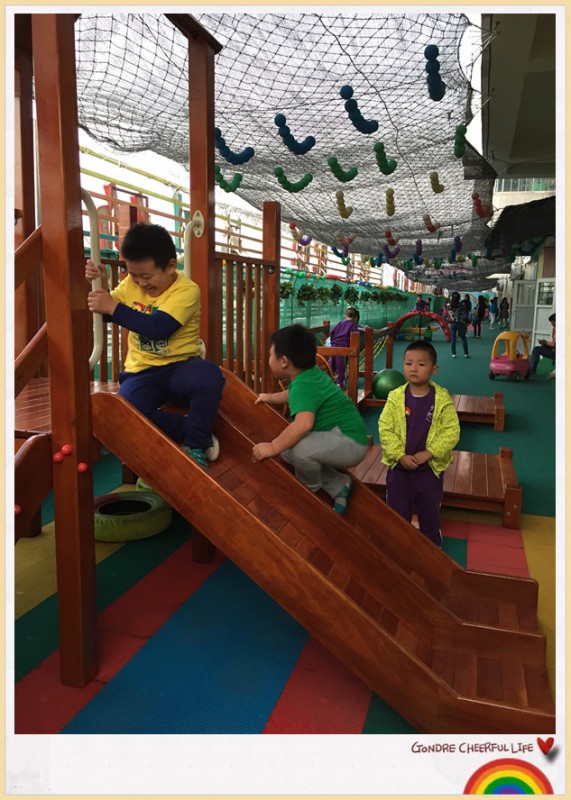 O(∩_∩)O哈哈~这幼儿园的场地真大,木制的滑梯好干净( ⊙ o ⊙ )啊!