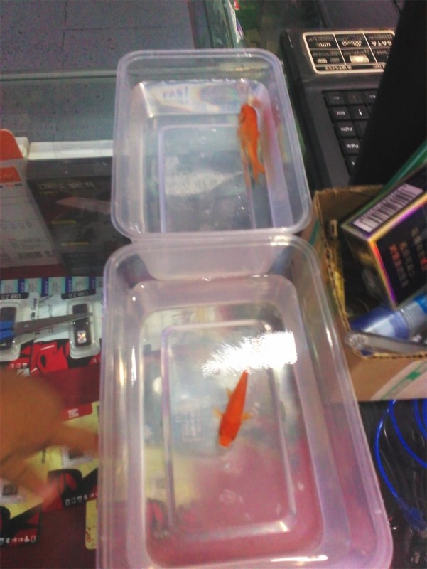 一次性饭盒要干净,无油,水要放几天去氟,水太多鱼会跳出来,饭盒不适合养这么大的鱼。