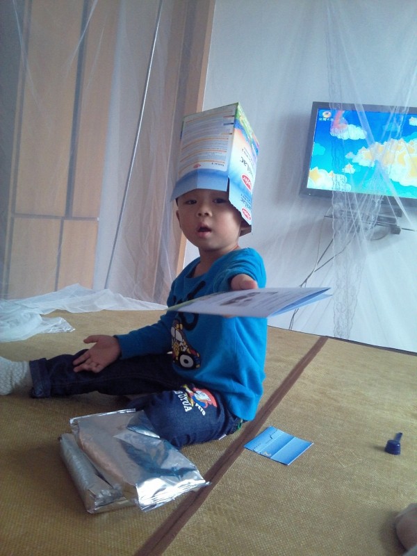 前几天收到了申请的奶粉,儿子现在喝的奶粉刚刚新开了一罐,我就把申请到得拿到了楼上,打算喝完再给他喝申请的奶粉。今天儿子上楼玩看到了,就说是他的奶,要自己收着。告诉他现在不能开,等家里的喝完才可以,小家伙同意了,就说看看,我也就随他去了。 把勺子拿出来玩了会,等我再看得时间两袋奶粉也放在了床上,小家伙居然把奶粉盒当帽子带头上了,看得人觉得真逗,同时也是很无奈。这小子总能想出法子玩手上现有的东西,我能夸他这是聪明嘛!