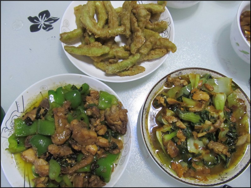 炒至差不多熟了,再放入青椒和葱段,没错,葱段放两次,我家老公比较爱吃。然后加入少量的盐就好,因为酱油和酱本身就有着比较重的盐味。出锅后吃一口鸡肉,哇,好嫩好好吃,所以一般炒鸡我都是自己做,比较符合自己的口味。油菜炒肉这个是很多家庭都会做的,所以我也不详细说了,一般这个肉我都会买比较嫩的肉,Aric对肉有些挑剔,太肥或者太瘦都不喜欢,要求特高。 老公炸的米豆特别好吃,他先是洗净了米豆,晾干后裹了面粉,然后放在油锅中炸。这个火候和技法还是挺重要的,如果是我来,或许有的生,有的糊,但是老公站在油锅前就一直在不停的翻涌,倒是炸的蛮好看的。最后撒上点盐,上桌后我们都一人先抓着一根吃起来,好吃好吃。所以嘛,不是男人不会做,而是男人不肯做,如果他每天下厨,肯定比我的厨艺强很多,嘿嘿。 ![]() 老公炸的米豆。 ![]() 家常版的辣子鸡。 ![]() Aric爱吃的小青菜。 ![]() 煮了点大米小米粥,宝贝很爱喝。 ![]() 简简单单一餐饭,但是却获得了一家人的好评,嘻嘻,果然还是自己做的最好吃啊。
