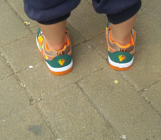 果不出我所料,小不点很喜欢老板推荐的那一款超人波鞋,一是因为鞋子上面印有他喜欢的超人的图案;二是因为这鞋子的鞋跟那有闪光灯,走路的时候一踩到那电子感应器那鞋跟的闪光灯就会发亮。刚开始时我为小家伙选了一对32码的,后来让他穿上去后叫老板娘帮忙看看孩子是否合脚,结果老板娘说小不点穿31码就行了,32码太大了,在孩子脚跟那能塞两只手指呢。旁边买鞋子的一位妈妈也说我儿子穿32码的鞋子看起来很大,不太合穿,这样容易摔跤的。于是我赶紧叫老板娘换过一双31码的超人波鞋,按照老板娘的方法把手指伸到小家伙的脚跟后面去量度孩子是否合脚,结果发现能塞一只竖起来的手指,然后老板娘就说31码的鞋子小不点穿刚刚好。