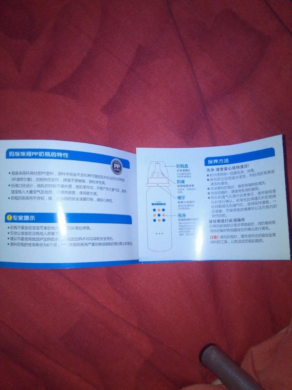这款奶瓶的牌子是妈咪咪娅的,貌似我没有听过啊,嘿嘿。。。说实话,刚打开小纸箱包装的时候看到的第一眼觉得就是塑料的,有点失望。后来打开看了奶瓶确实是PP材料的,也算是放心了,要是塑料的咱可不敢用的。 说明书很是小巧,尤其我比较喜欢里面的一段话:我们支持母乳喂养,母乳是婴儿最富营养的食物,尤其是在婴儿出生一年内。而且母乳喂养促进婴儿和母亲的情感维系。大宝随着年龄的增长,也换过好几个品牌的奶瓶了,可从来都没有看到过这么贴心的一句话,真是太让人意外和惊喜了,可见妈咪咪娅这个品牌是很用心的。