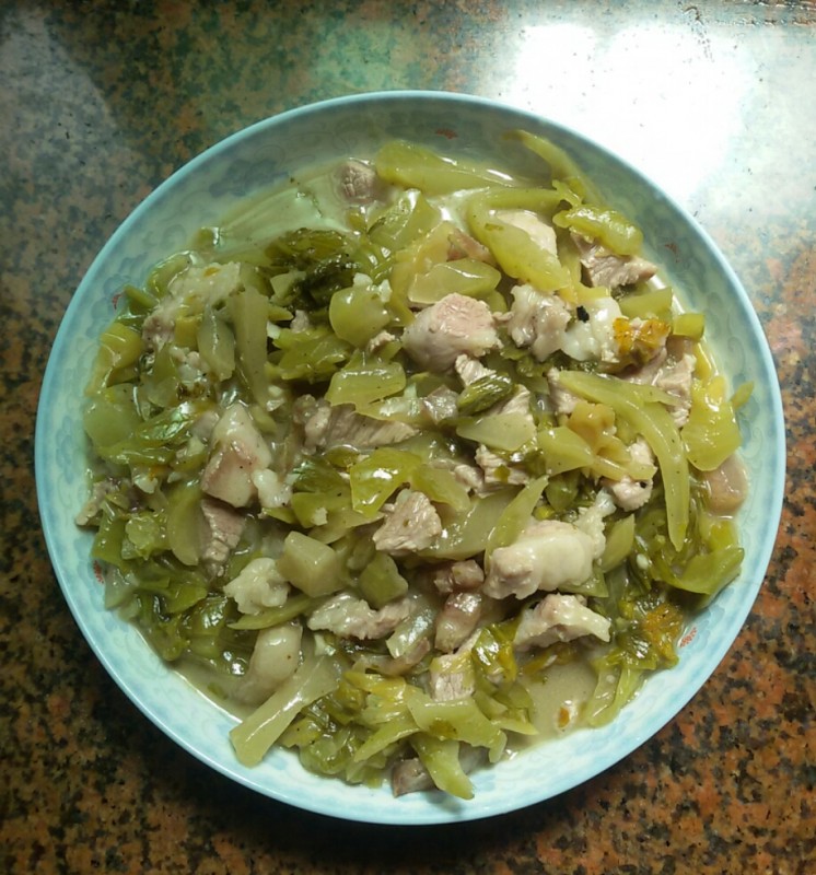 酸菜肉 听说做酸菜很吸油的,所以做酸菜时一定要多用油,最好用猪油来做。为此,我专门买来了肥猪肉(上肉)来做,把肥瘦完全分开,肥的用来“炸油”,瘦的用来炒。虽然这菜是用猪油做的,但做出来的酸菜肉却一点都不油腻,反而很开胃的感觉,而且这个菜也很好吃,酸菜脆脆的,瘦肉又嫩又滑的,口感也好。 材料准备:上肉半斤、酸菜、生姜(三片)、蒜末适量 步骤如下: 1、铁锅烧热,然后加入切好的肥猪肉放锅里翻炒,翻炒至变色后就盖上锅盖,然后调小火,让肥肉在锅里慢慢“炸油”。虽然这肥肉不多,但几分钟后就能炼出很多的猪油了,然后把炸过后的猪肉装起来备用,但猪油不用装。 2、把小火调成大火,然后在猪油里迅速加入生姜片,然后再加入切好的酸菜翻炒,然后再加入适量的清水盖上锅盖焖一会,待汁水还剩一点点的时候就加入瘦肉翻炒,炒到瘦肉变色时就加入用生粉、蚝油、胡椒粉、盐、酱油和水调好的淀粉水,然后再煮一两分钟后加入蒜末就可以出锅食用了。