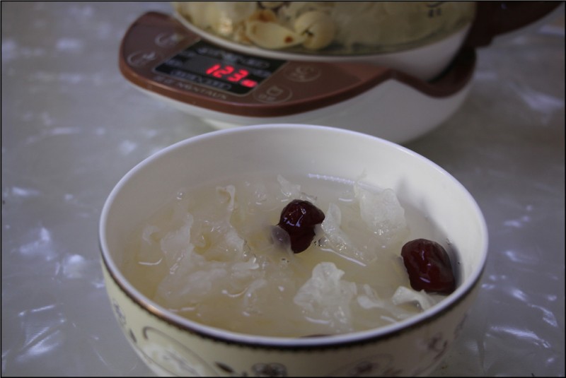 大概二十分钟,就煮好了我要喝的银耳莲子羹,第一次做,感觉还不错,不过好像颜色不是图片上那种很浓的汤色。还需要再研究研究,下次做出更好喝的甜汤来。给自己盛了一碗先喝着,甜甜的,银耳的香味也随着煮了出来,这次没有放枸杞,准备下次和雪梨一起来煮,这几天就为了我的咳嗽,自己努力努力吧。而且也便宜了老公和Aric,他们早就希望妈妈多学做几种甜汤了。 亲们还有什么样的甜汤,比较适合咳嗽的人喝的吗?可以给我介绍一下,回头买了食材我自己煮着试一试。在我们山东,秋天是很干的季节,像咳嗽、鼻炎,是我家经常会发生的,不喜欢喝药,也只能在做美食方面,多去学一学、做一做了。为了家人的健康,作为主厨的妈妈我,还需要很高的发展空间,哈哈,所以我要多学习学习,多做点好吃的、好喝的滋润滋润啦。 ![]() 看我煮的银耳莲子羹,好看吗?哈哈,更好喝哦。