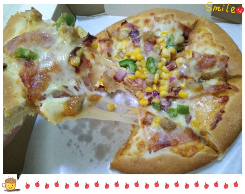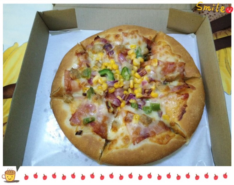 等待了不到半个小时,家门就被敲响,赶紧开门一看,披萨竟然到了,真的太快了。而且热腾腾的,和刚出烤箱的也没什么区别。迫不及待的拿到屋里打开一看,和我预料中的基本上一样,没有任何的减少,还有送的一次性手套,就这样简单的一个举动,还是让我蛮感动的,说明人家是真心对待每一个顾客的。而且外送员来的时候也是好声好气的,让人感觉心里暖洋洋的,觉得这餐订的值得。 等我拿出一块时,芝士拉丝还是比较长的,狠狠的咬上一口,香!老公不在家,儿子也去上兴趣班了,我只有一个人面对这么大个的9寸披萨,其实还是吃不了的。最后趁着热、趁着好吃,吃了四块,就撑得不得了,留下两块回头饿了自己热热吃,自己的两顿饭也就差不多了。下次我准备订米线尝尝,因为看评价还是挺好的,比披萨便宜,还有排骨米饭等等,也是我准备慢慢去尝试的,好期待哦。 ![]() 9寸的大荤王哦。 ![]() 有各种肉类,还有玉米、青椒、洋葱,芝士放的也不少,看来外卖也是可以相信的嘛。