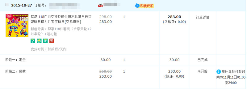 这套磁力片一共有118片,价值是298元。定金30元,可在双十一那一天抵用成45元,相当于优惠了15元。另外可领取一张10元的优惠劵,只能在双十一的那一天用,满238元减10元。算起来,我买的这一套磁力片一共优惠了25元,现在购买价是283元,已付30元的定金。好像优惠力度不大哦,不过这不是重点,重点在于前20000名会赠送30片的套盒,而我就是第12592名,嘻嘻。 总的算下来,就是用273元购买118片一套+赠送的30片一套。是不是超优惠啊,哈哈,而且天猫的货,质量上我还是比较放心的,看评价也都说很好呢。嘘,这是个秘密,我并没有告诉Aric,因为我想等到收到货以后再送给Aric,作为圣诞节的礼物,如果现在就告诉他了,可能他就会每天都催着问我礼物什么时候到?真的会像唐僧一样唠叨的。所以不告诉Aric,等我付了尾款收到货再给他惊喜。 ![]() ![]() ![]() ![]() ![]()